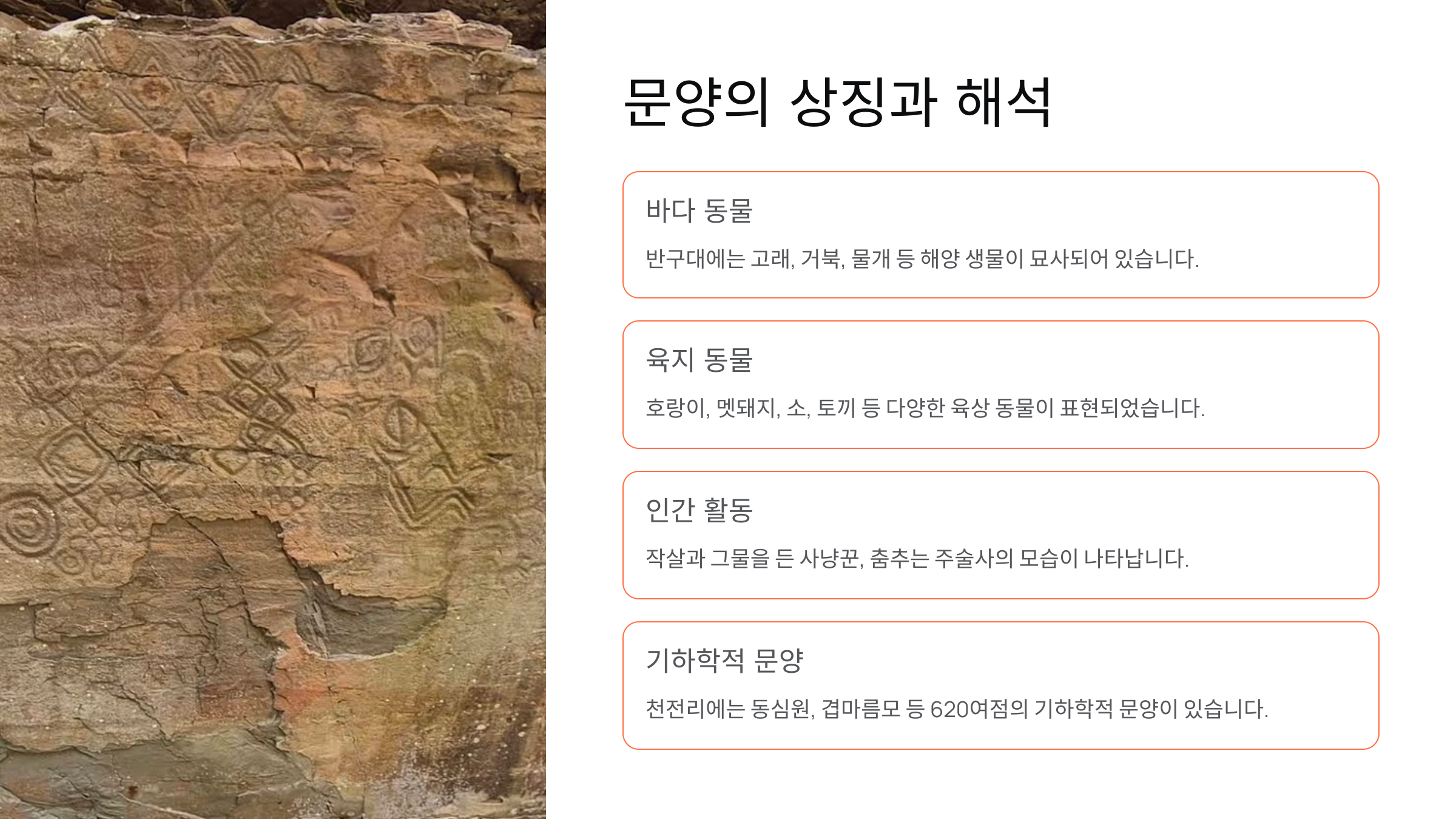 암각화는 문자보다 이전 시대의 시각적 기록 매체로, 당시 사람들의 사고방식이나 생활 모습을 짐작할 수 있는 중요한 단서가 돼요. 반구천에서는 특히 원형, 삼각형, 십자형, 파상선(물결 모양) 등이 많이 발견돼요.