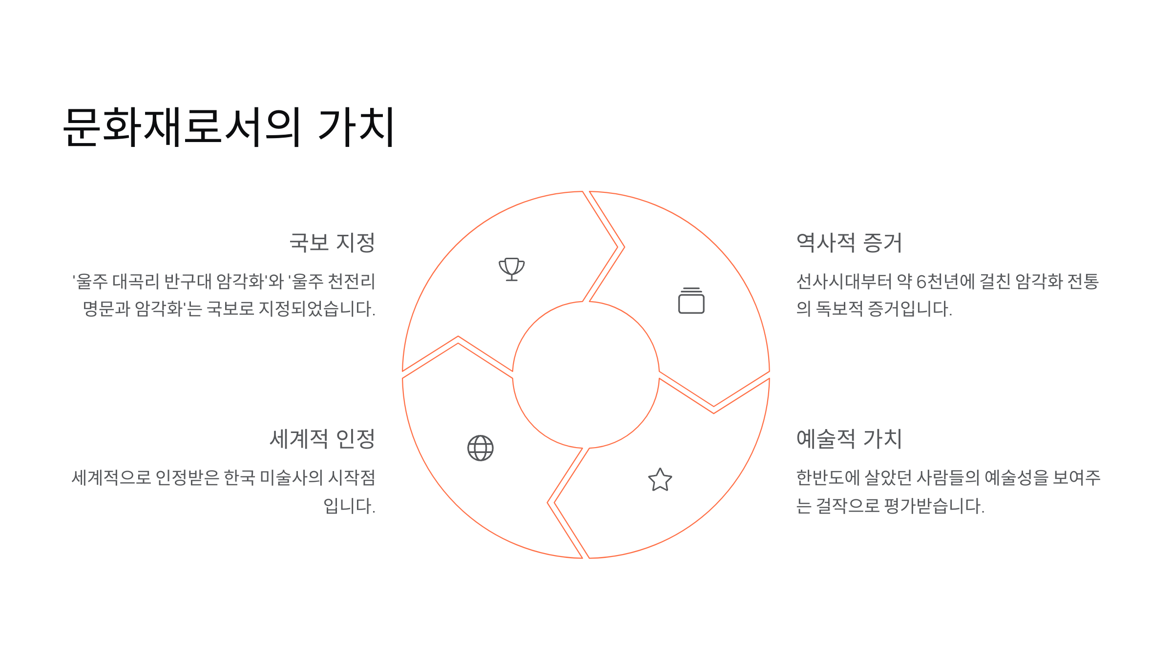 반구천 암각화는 이런 다양한 가치들 덕분에 한국 선사문화의 정수를 보여주는 상징적인 유적으로 자리매김하고 있어요. 지역사회의 소중한 문화유산으로서도 사랑받고 있고요.