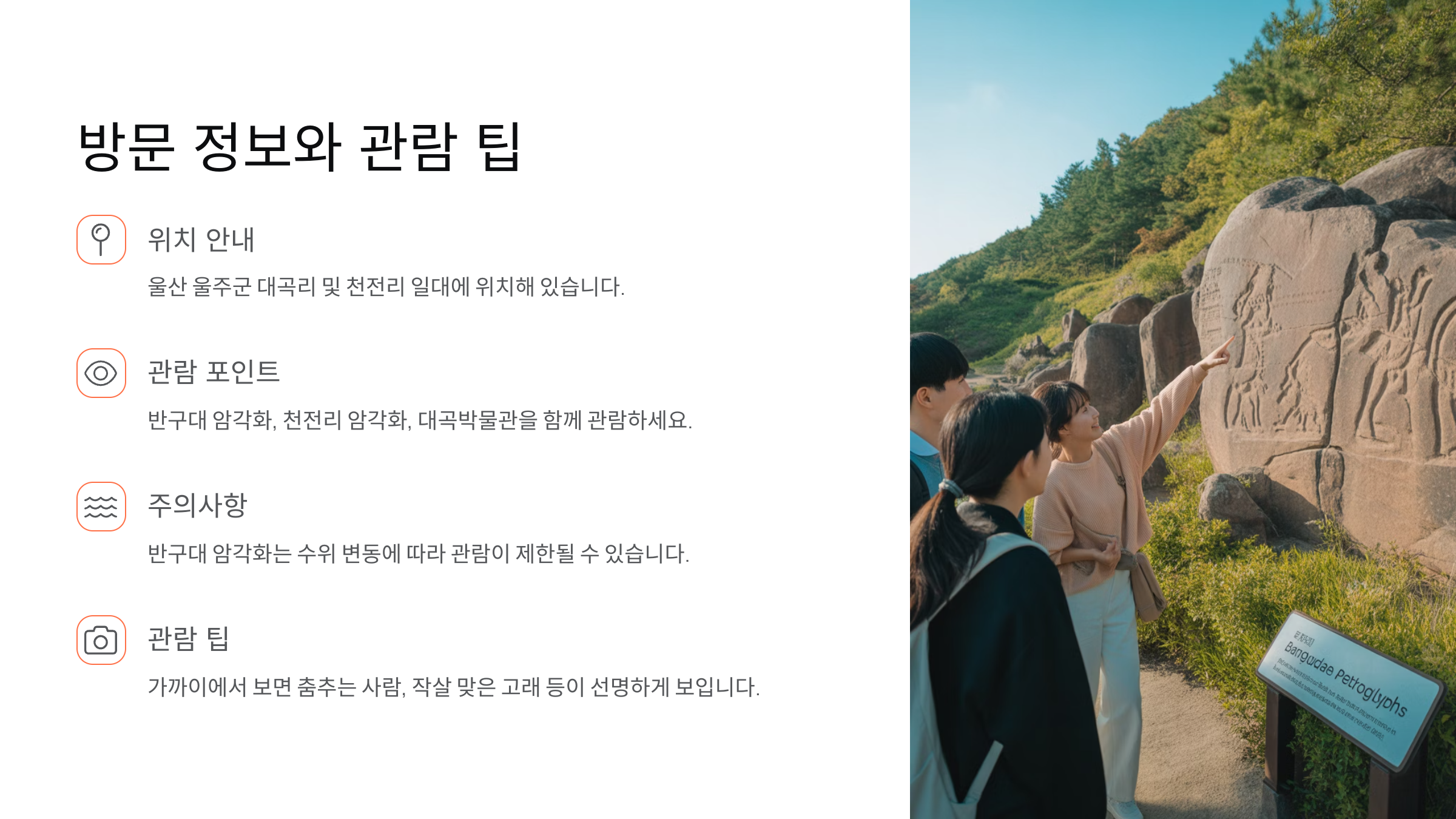 마지막으로! 문화재 관람 시에는 손으로 만지거나, 낙서를 하지 않는 것이 기본 예절이에요. 암각화는 자연과 인간이 함께 만든 귀한 자산인 만큼, 다음 세대를 위해 우리 모두가 함께 지켜야 해요 💖