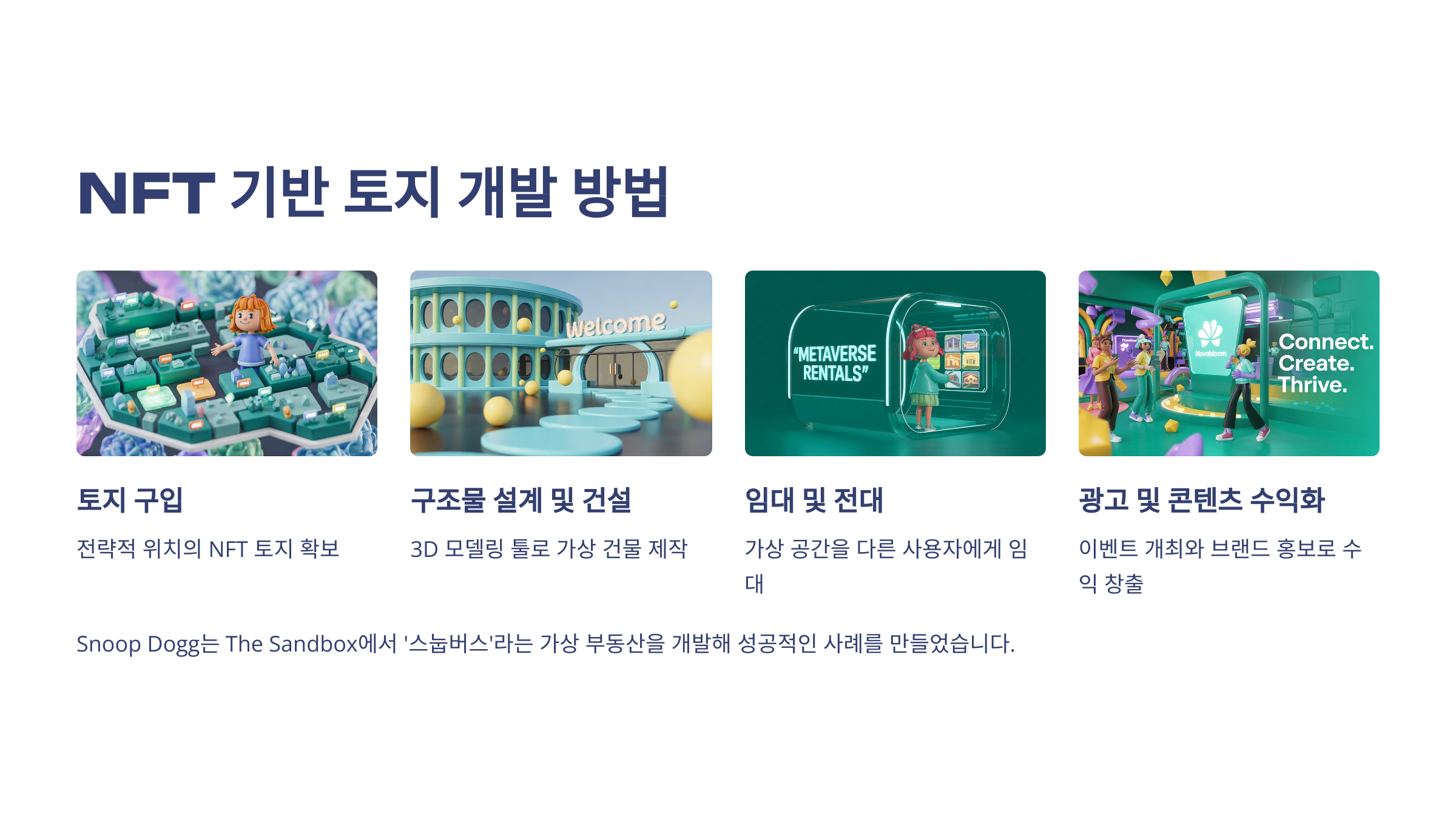 NFT로 소유한 메타버스 토지는 그냥 놔두기보다 개발해서 가치를 높이는 게 좋아요. 땅에 건물을 세우거나, 테마 공간을 만들어서 임대 수익을 창출하거나 재판매 시 높은 프리미엄을 붙일 수 있답니다! 🏗️