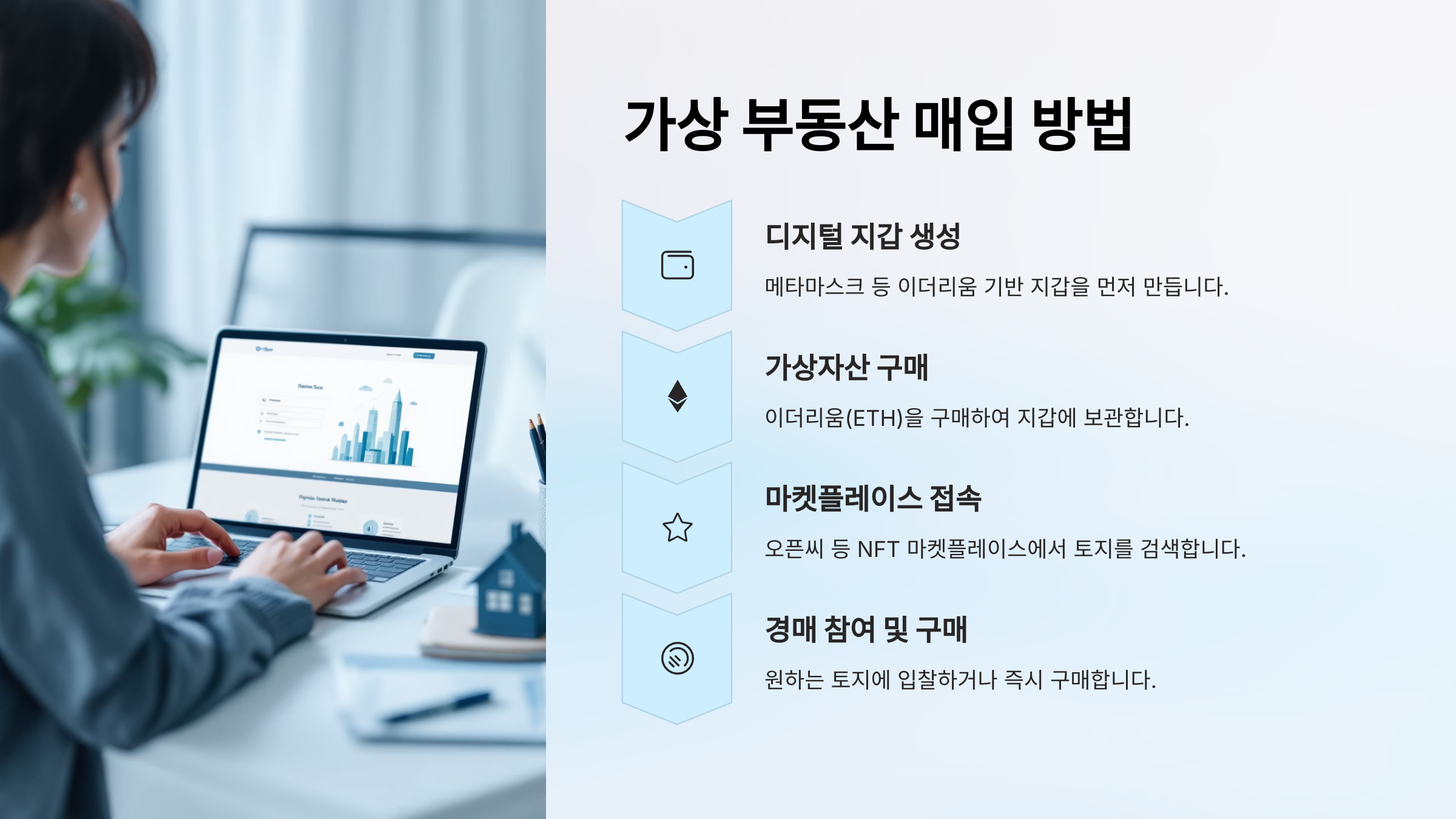 A1. 메타버스 플랫폼 가입 후 가상자산 지갑을 연결하고, NFT 형태로 토지를 구입하면 돼요. 오픈씨 같은 마켓플레이스에서도 거래할 수 있어요.