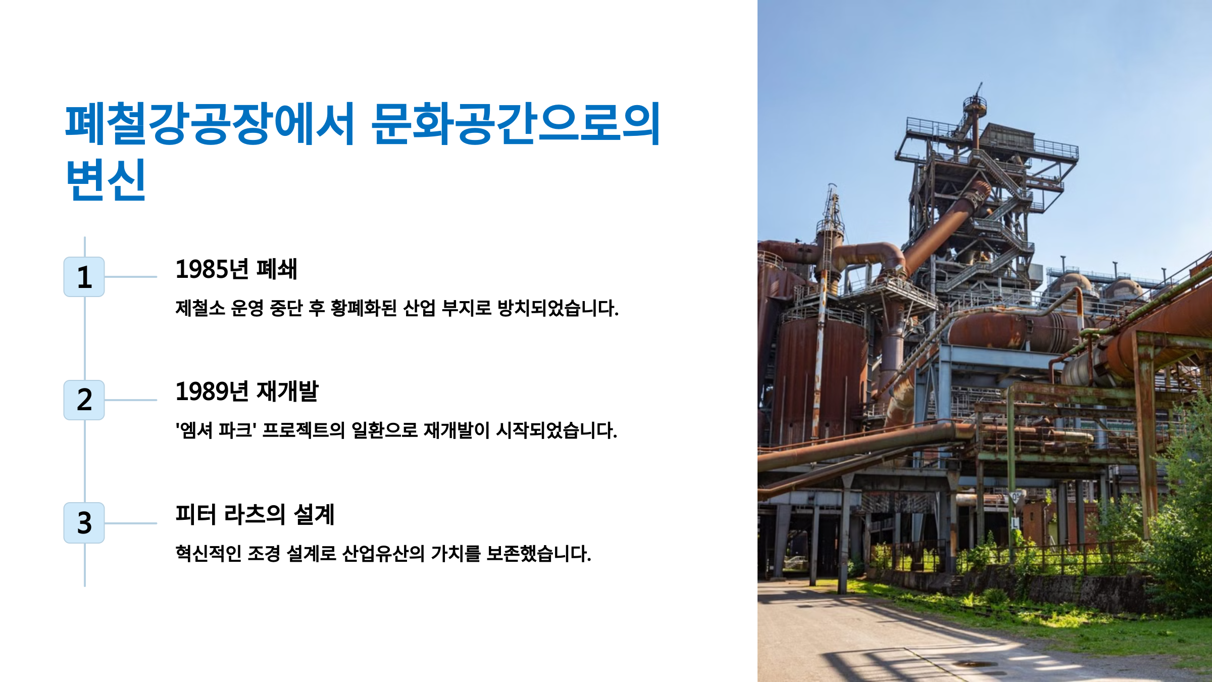 이처럼 단순한 철거가 아닌 **창조적인 변화를 통해 산업 유산을 활용하는 방식**이 세계적으로 큰 주목을 받았어요. 🏭✨