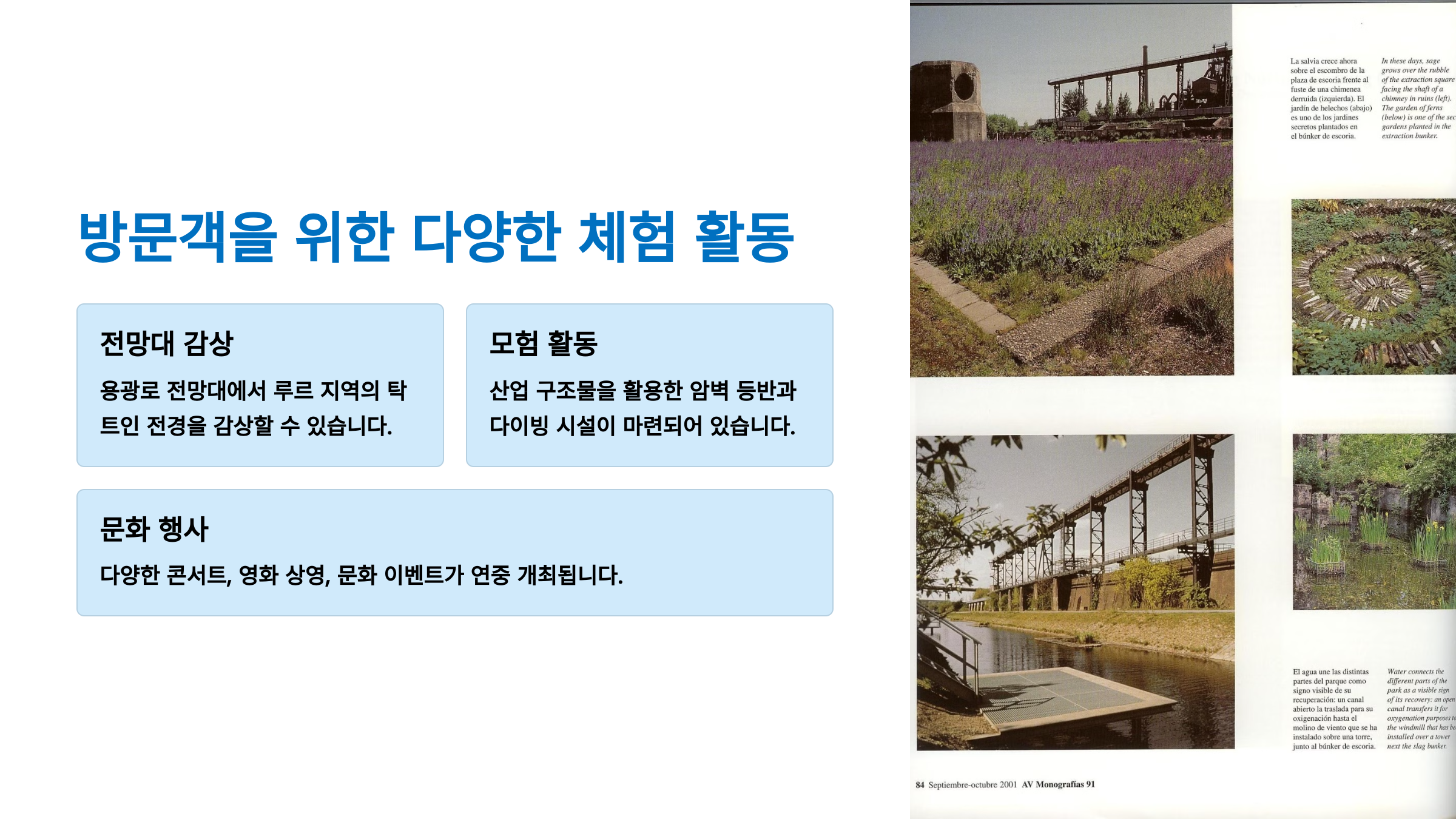 | 🎭 문화와 산업의 조화 | 폐허 속에서도 예술과 체험 공간을 창출 |