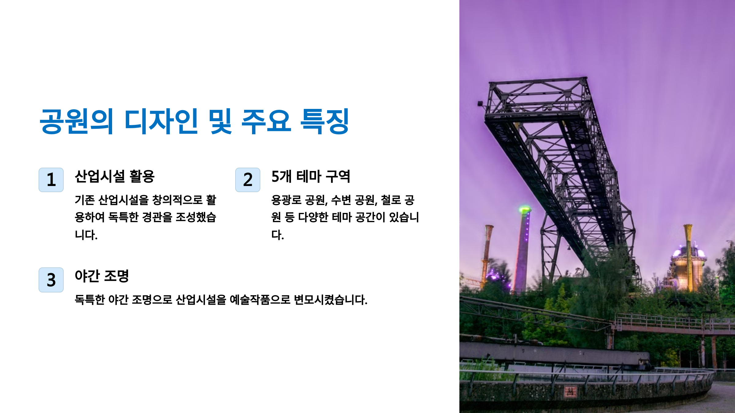 내가 생각했을 때 이곳은 단순한 공원이 아니라, **과거와 현재가 공존하는 살아있는 역사 공간**이에요. 녹슬고 버려졌던 거대한 공장 시설이 독특한 분위기의 공원으로 재탄생하면서, 지역 사회와 방문객들에게 큰 영감을 주고 있죠.