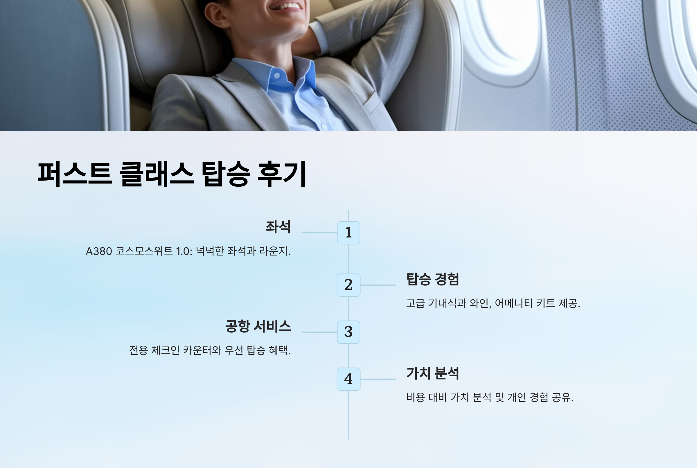 퍼스트 클래스 탑승 후의 후기는 기대 이상이었고, 다시 한 번 경험하고 싶은 마음이 가득해요.