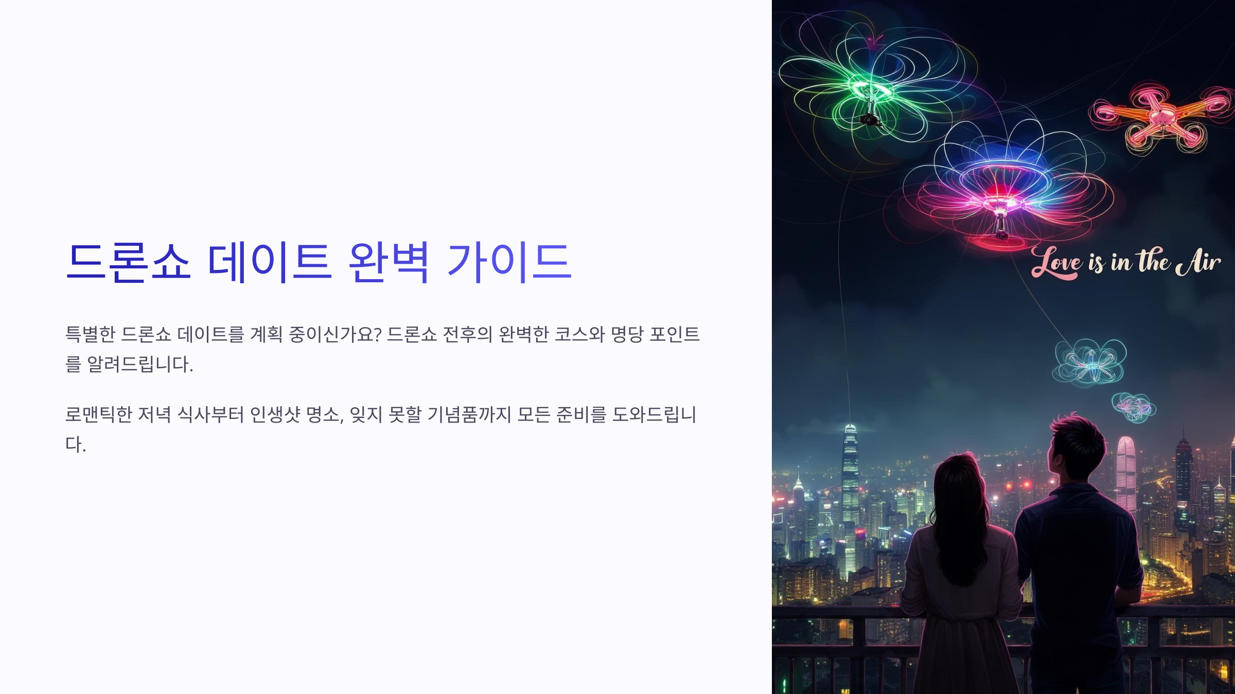 드론쇼는 커플 데이트 코스로 완.전.최.고예요! 낮에는 분위기 좋은 카페에서 티타임, 저녁엔 강가 산책과 야경 드론 퍼포먼스로 감성 폭발 💕