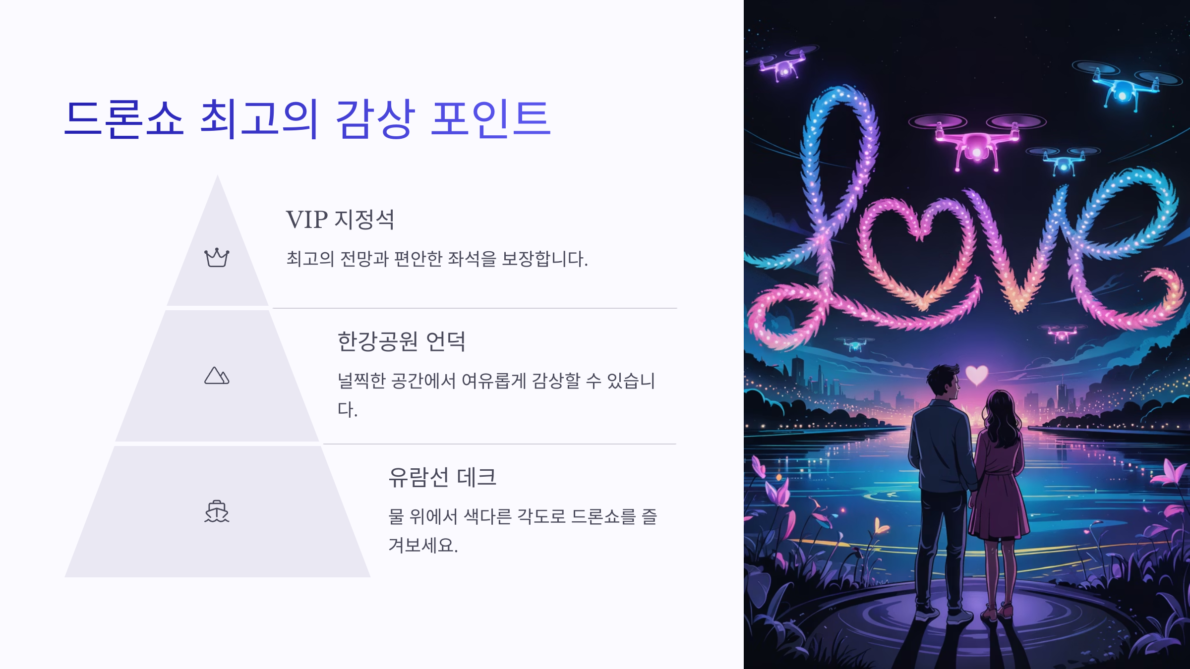 내가 생각했을 때 드론쇼는 영화관보다 낭만적이고, 테마파크보다 차분한 분위기가 있어서 진짜 특별한 추억 만들기 최고예요. 지금부터 한강 드론쇼 맞춤 데이트코스 쫙 소개해줄게요!