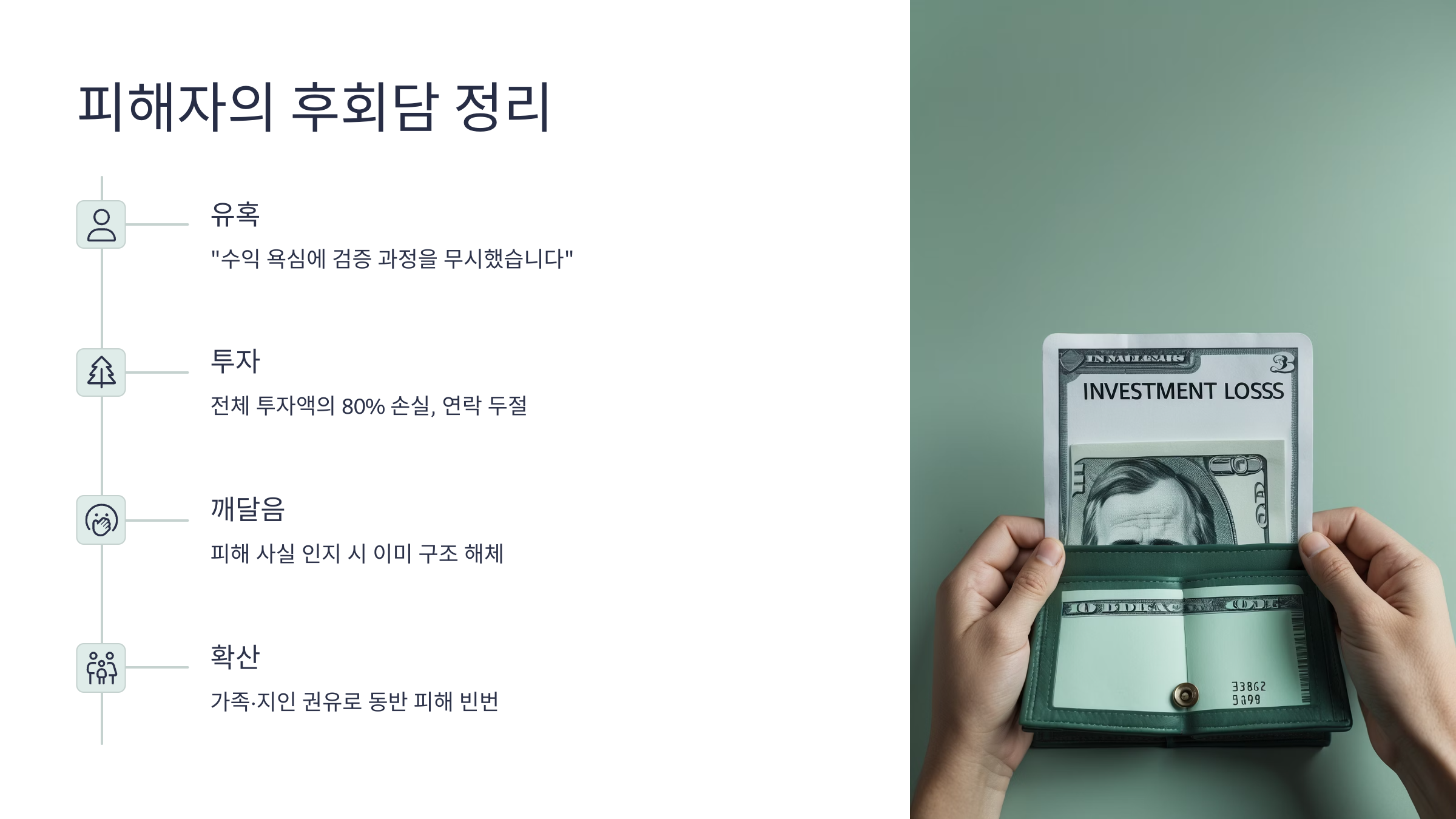 | B씨 (60대 퇴직자) | 지인 추천으로 안심 | 3천만 원 손실 | 공식 기관 확인 안 한 점 |