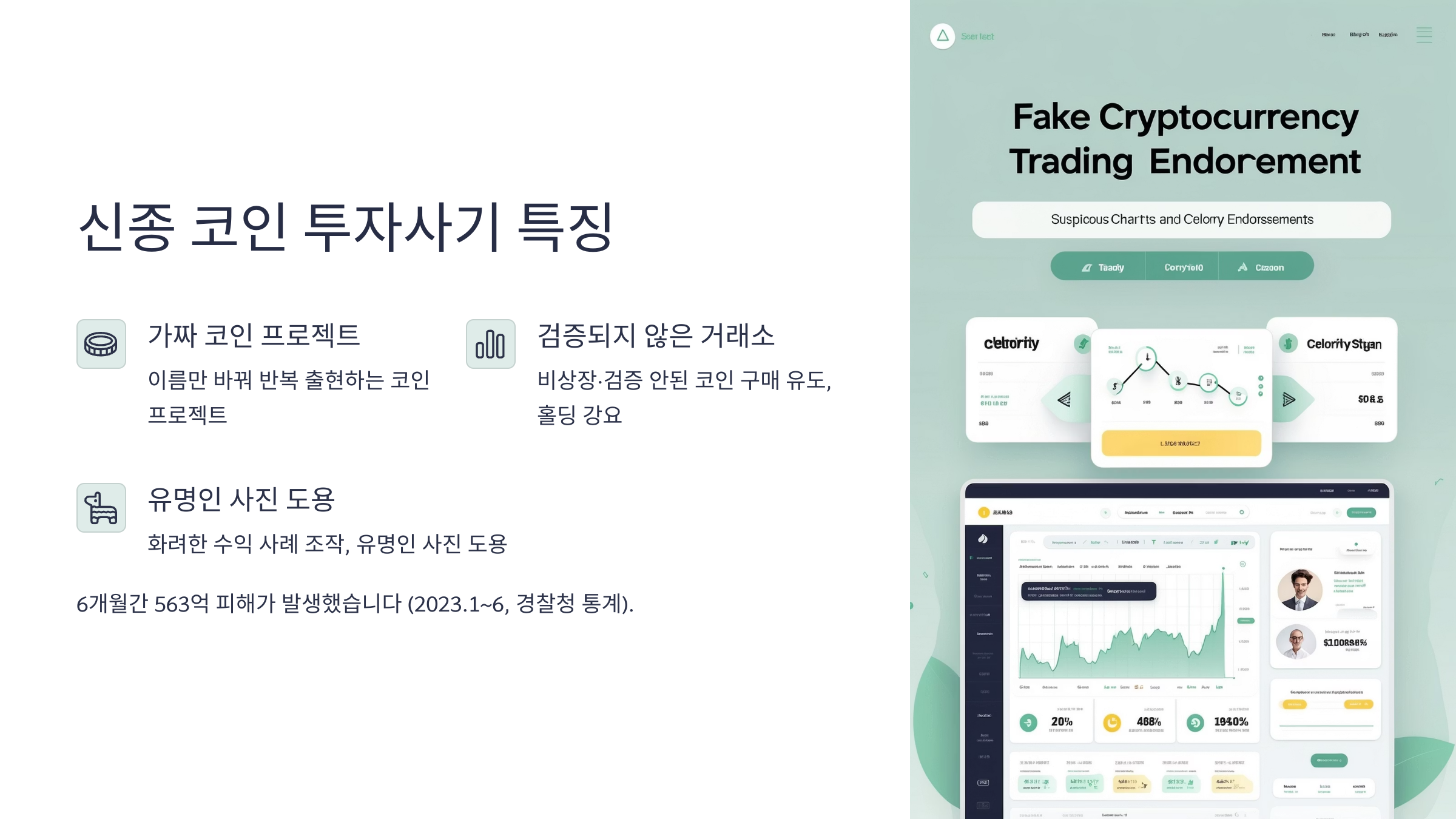 | 자체 거래소 전용코인 | 가짜 플랫폼에서만 거래 | 출금 제한, 폐쇄 후 사라짐 |