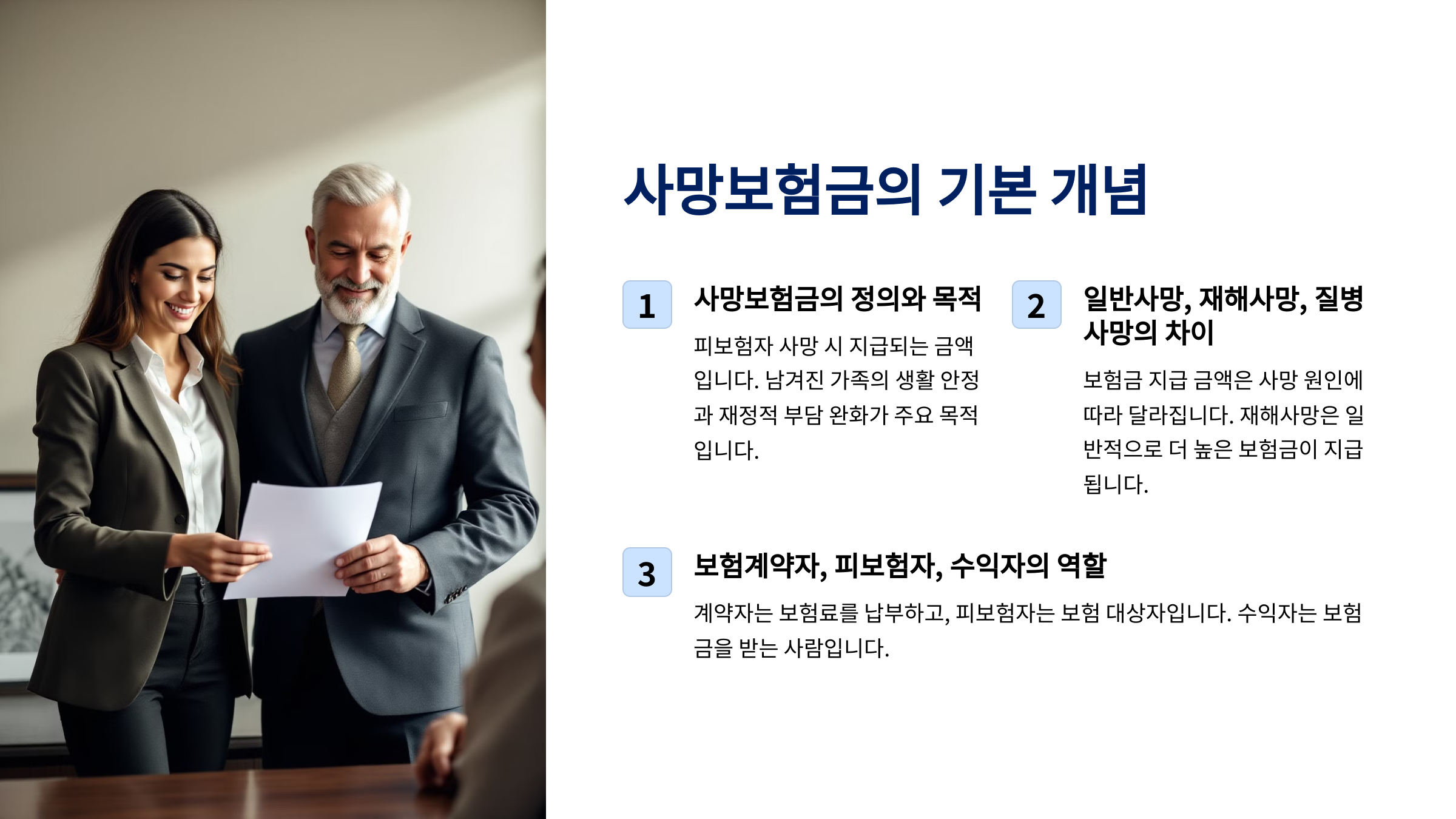 사망보험금은 피보험자가 사망했을 때 보험사가 유가족(수익자)에게 지급하는 금액이에요. 이 금액은 사망 후 유족의 경제적 안정을 돕기 위한 목적이 있어요.
