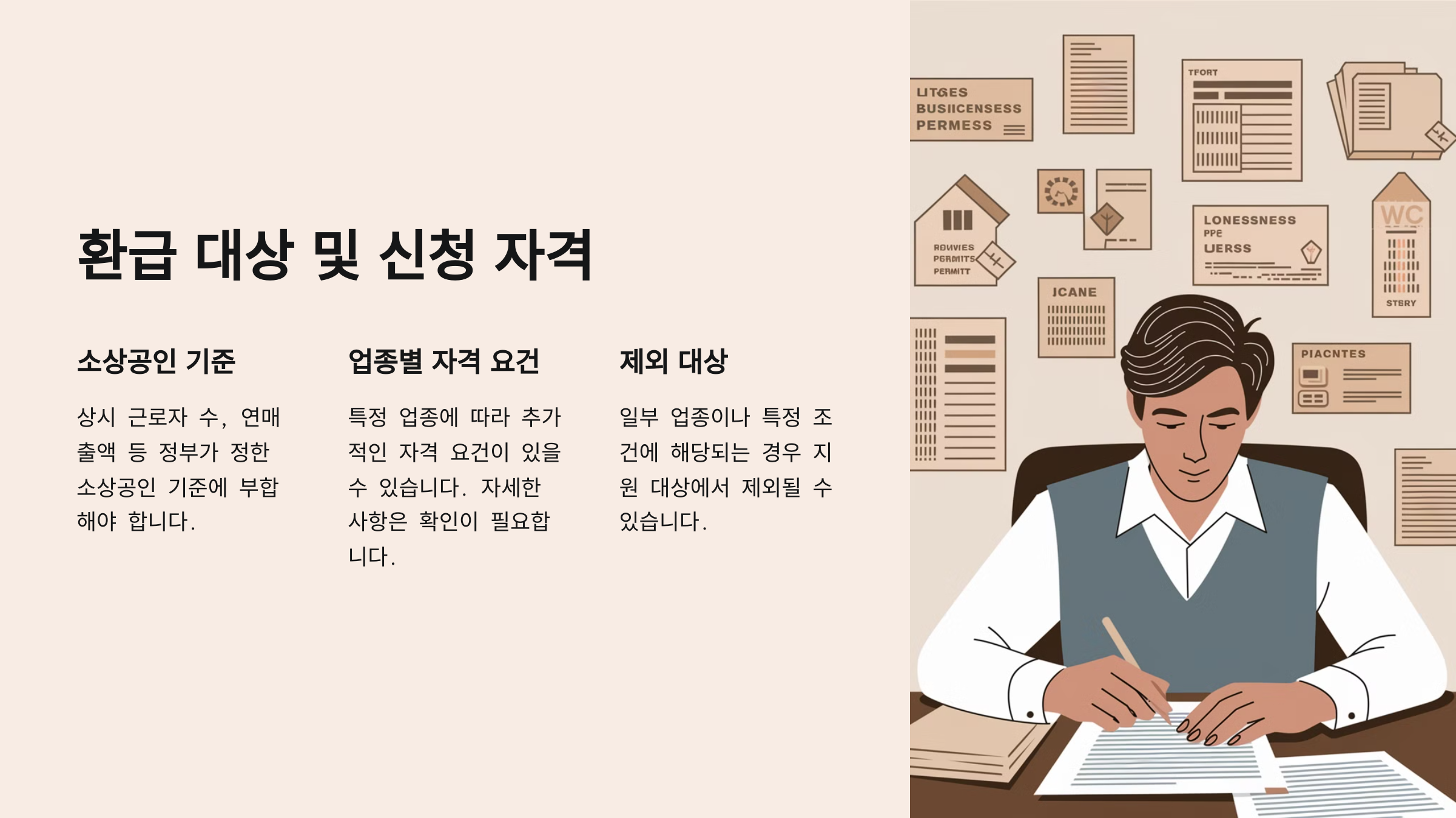 소상공인 환급지원금은 특정 조건을 충족하는 사업자만 받을 수 있어요. 업종, 연매출, 직원 수, 사업장 형태 등에 따라 지원 여부가 달라질 수 있죠.