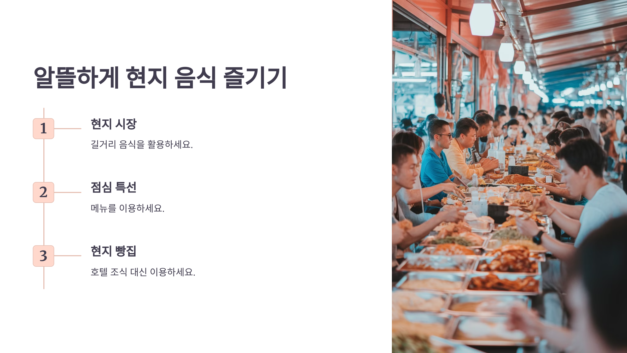 이제 **식비를 절약하면서 현지 음식을 즐기는 방법**도 알아볼까요? 🍽