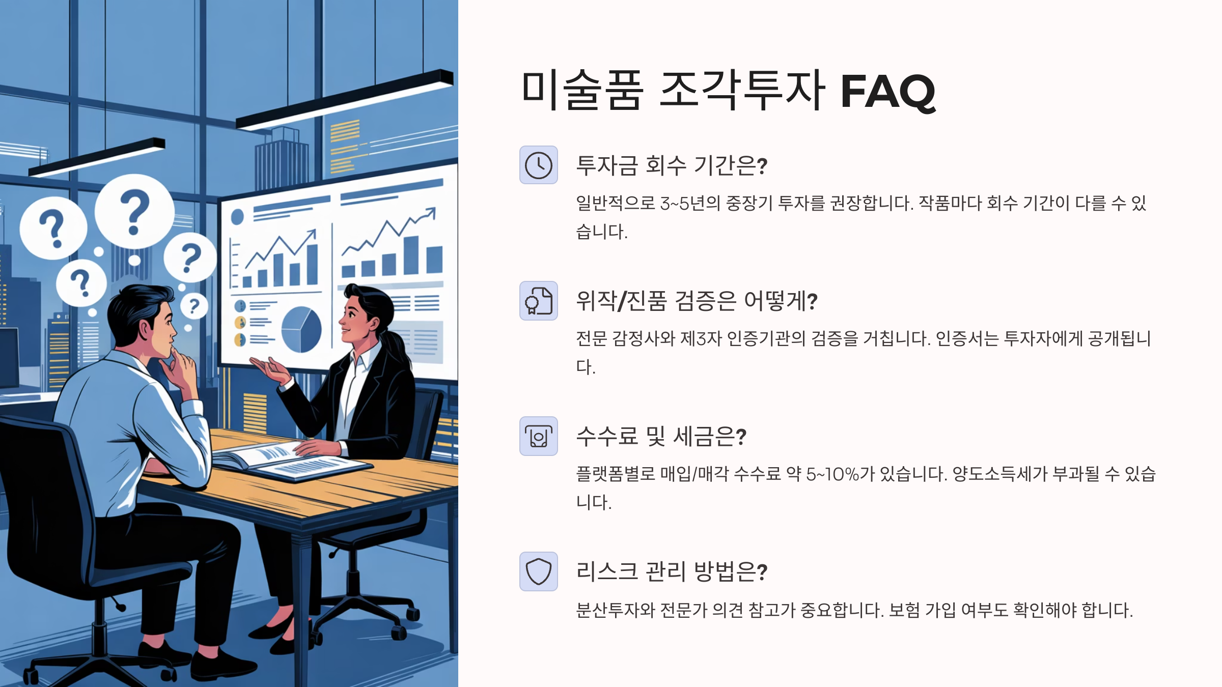 이제 마지막으로, 미술품 조각투자를 시작하려는 분들이 가장 자주 묻는 질문들을 FAQ 형식으로 정리해드릴게요! 🙋