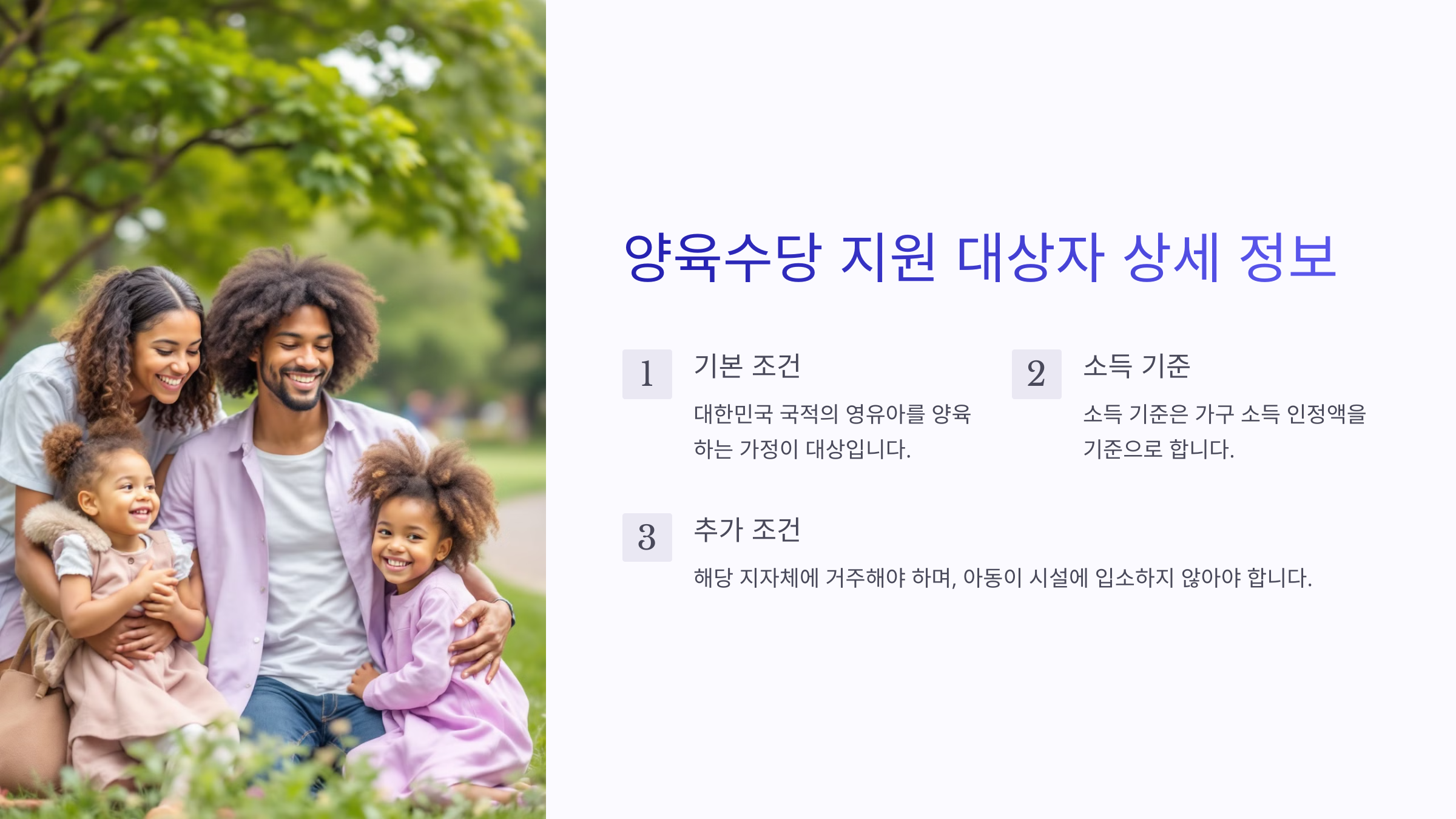 양육수당은 어린이집, 유치원, 종일제 보육시설을 이용하지 않는 가정에서 아이를 직접 양육하는 부모에게 지급돼요. 지원 대상이 되는지 확인하려면 아래 조건을 살펴보세요.