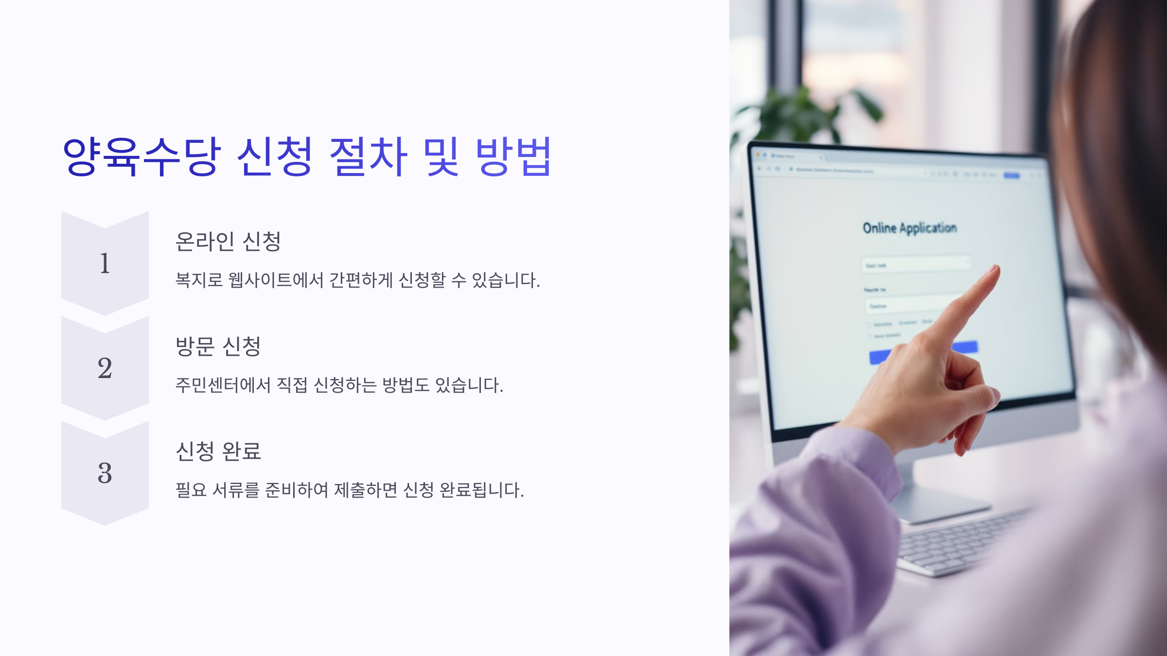 양육수당은 온라인과 오프라인에서 쉽게 신청할 수 있어요. 신청 후 심사 절차를 거쳐 승인되면 매월 25일 지급돼요!