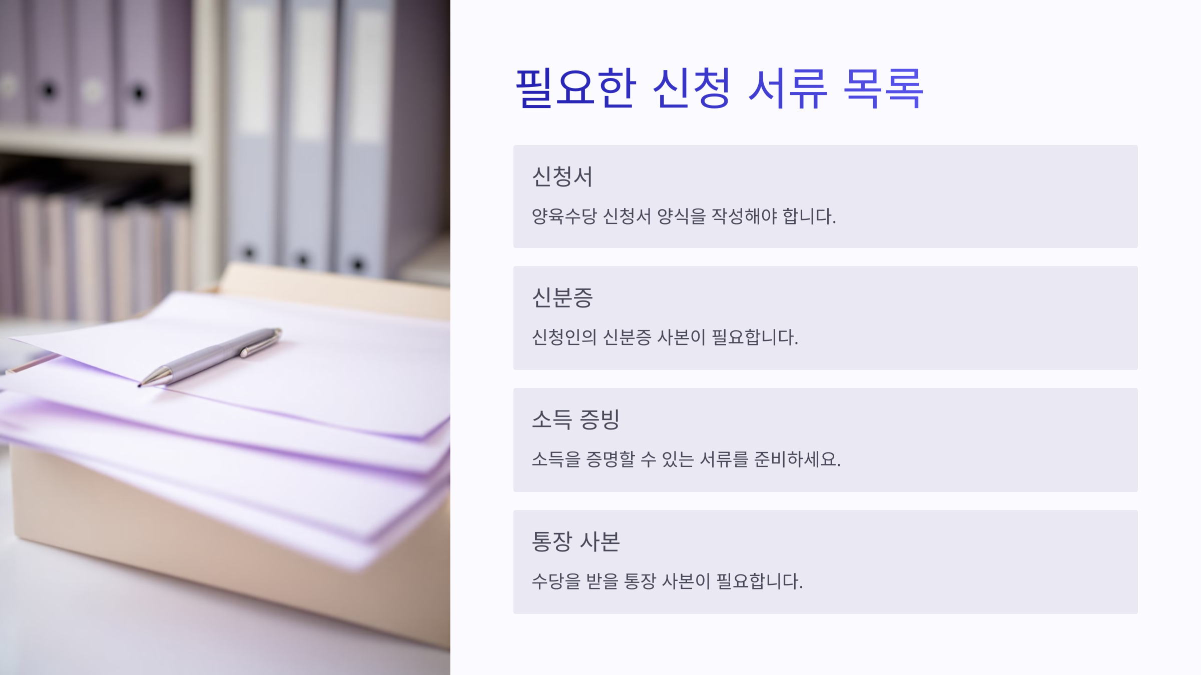 양육수당을 신청하려면 몇 가지 서류를 준비해야 해요. 신청 방법에 따라 온라인과 오프라인으로 구분되며, 필요한 서류도 다를 수 있어요. 아래에서 신청 절차를 자세히 알아볼게요!