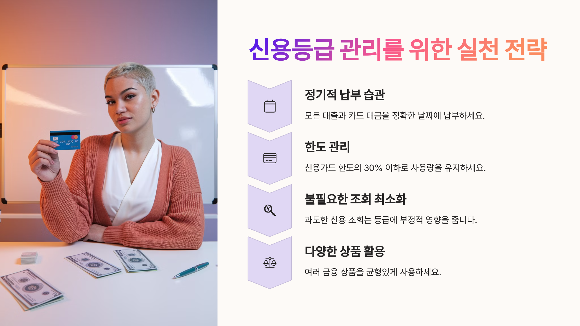 이제 어떤 요소가 등급에 영향을 주는지 알았으니, 다음 섹션에서는 실생활에서 어떻게 실천할 수 있는지, 즉 신용을 올리는 ‘생활습관’에 대해 이야기해볼게요! 💡