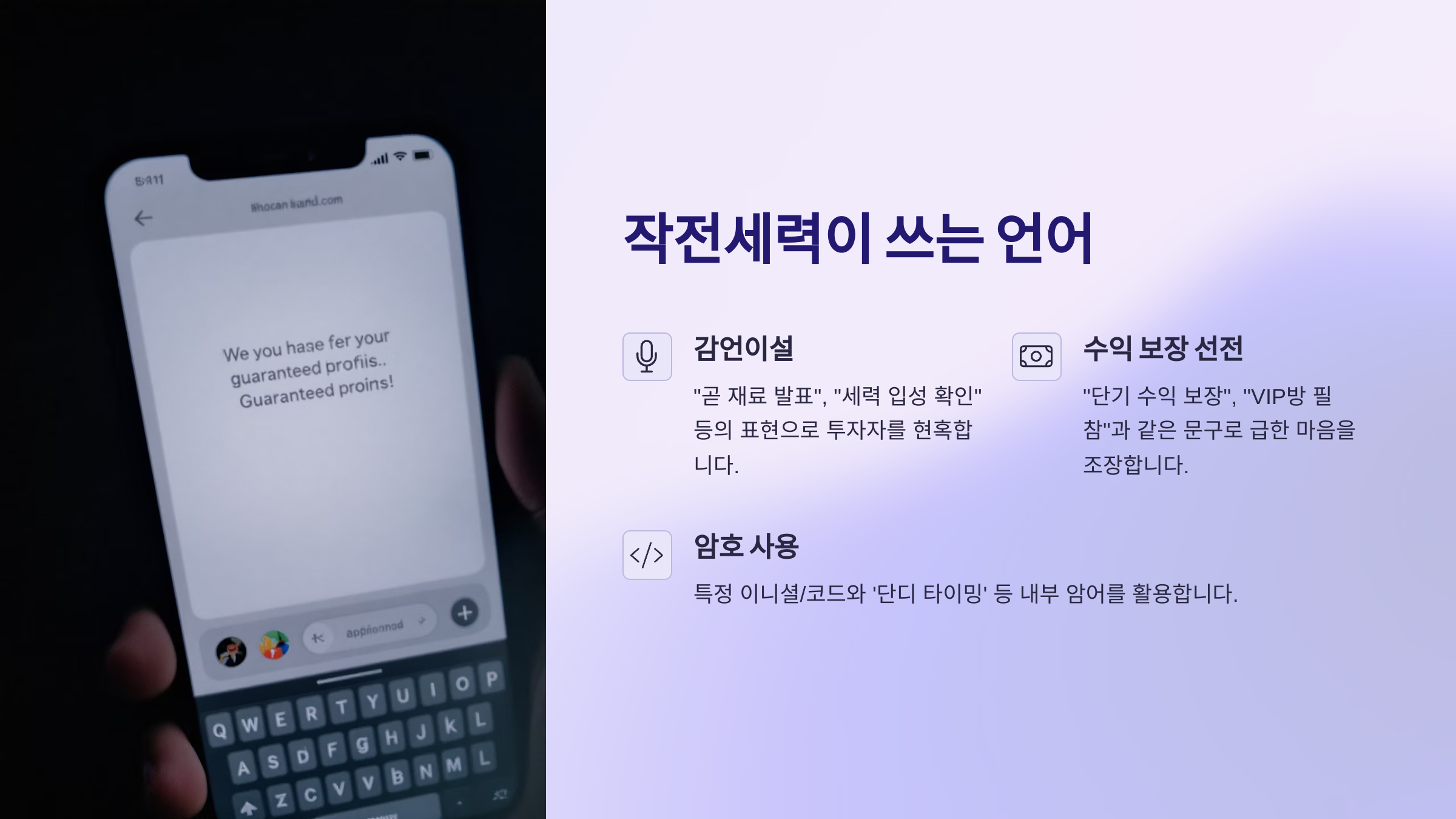 이처럼 주가조작은 정해진 시나리오를 따라 움직여요. 다음 섹션에서는 작전세력들이 투자자를 끌어들이기 위해 사용하는 ‘특유의 언어’에 대해 알려드릴게요. 🗣