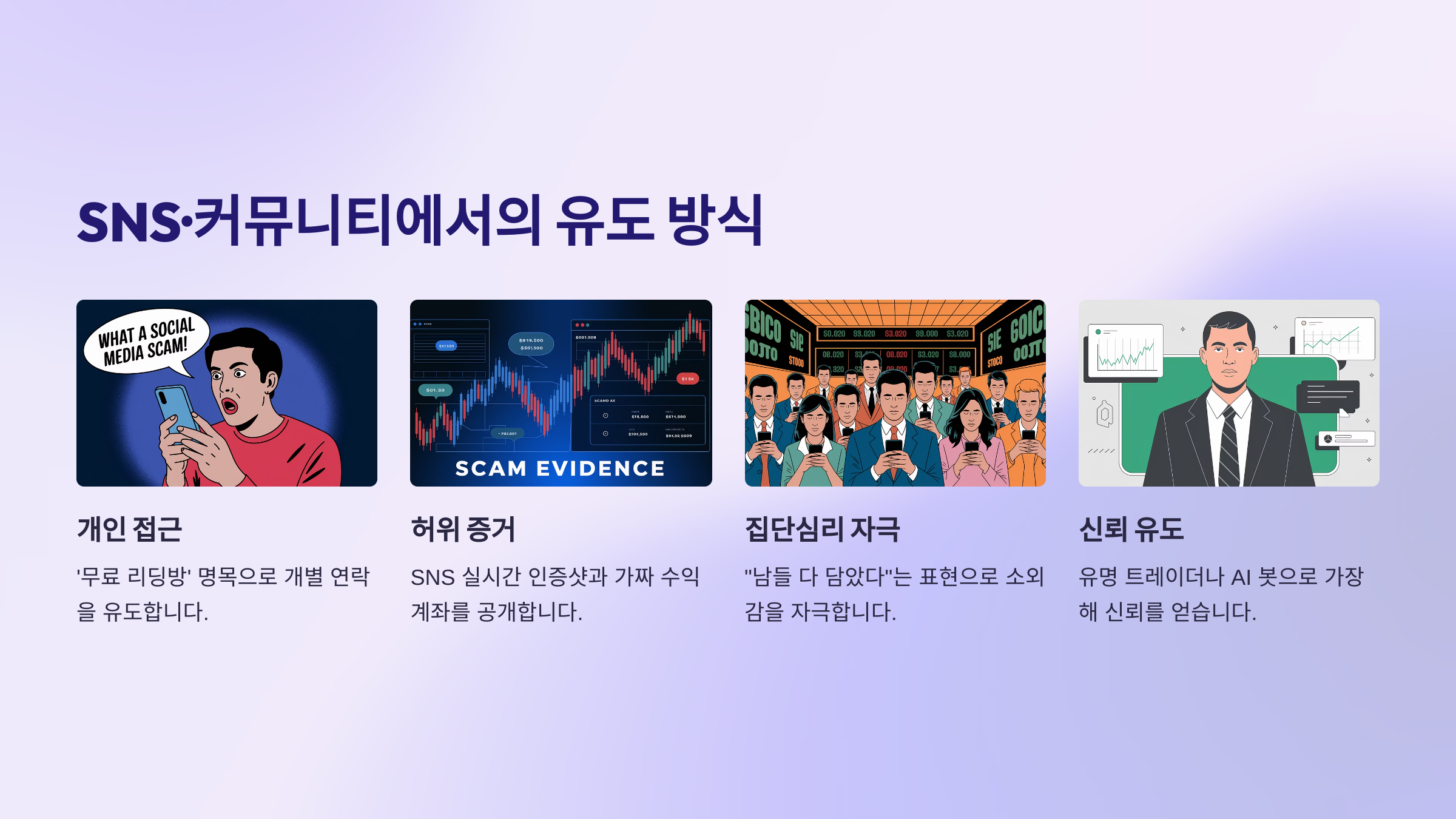| 위장 참여자 | 수익 자랑, 후기 작성 | 패턴 반복, 증빙 없음 |