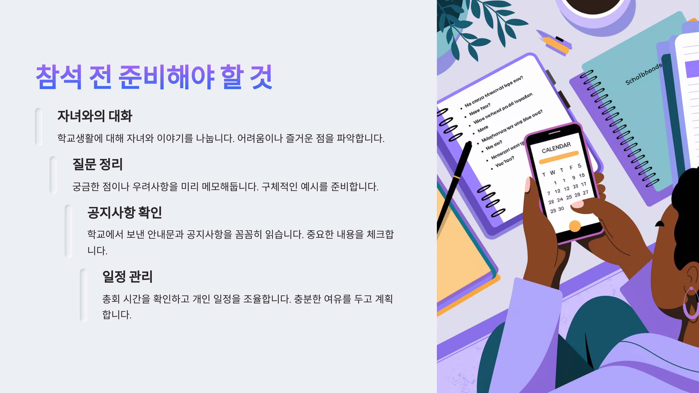 학부모총회를 보다 효율적으로 참여하려면 사전에 몇 가지 준비가 필요해요. 미리 준비하면 회의에서 더 많은 정보를 얻을 수 있고, 중요한 질문을 할 수도 있어요.