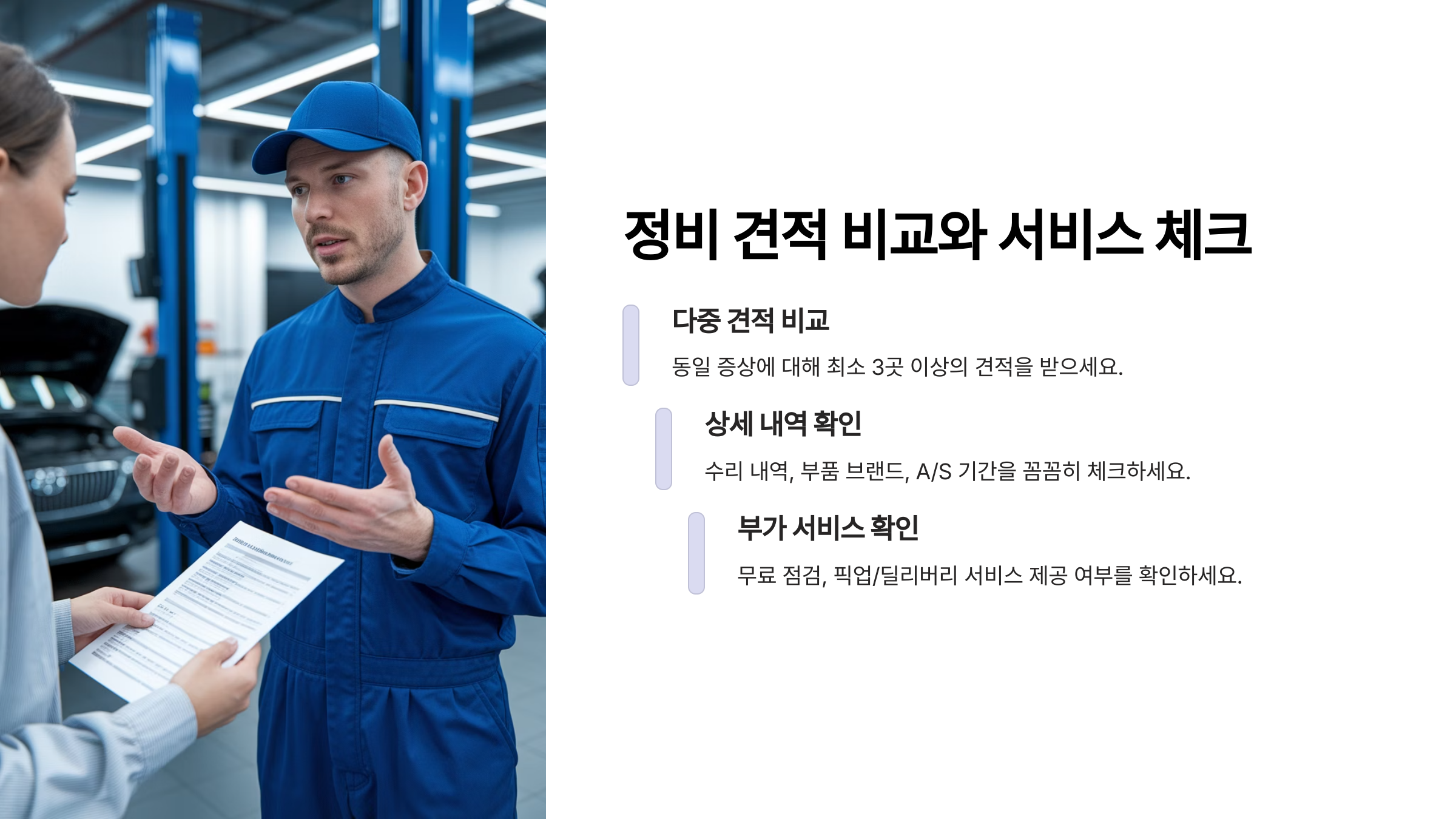 정비 견적은 단순 가격뿐 아니라 신뢰와 합리성을 확인할 수 있는 중요한 기준이에요. 같은 비용이라도 누가 더 정직하게 설명하고, 어떤 부품을 쓰는지가 결국 서비스 만족도를 좌우하죠! 다음은 정비소에서 어떤 서비스를 제공하는지도 살펴볼게요 🔍