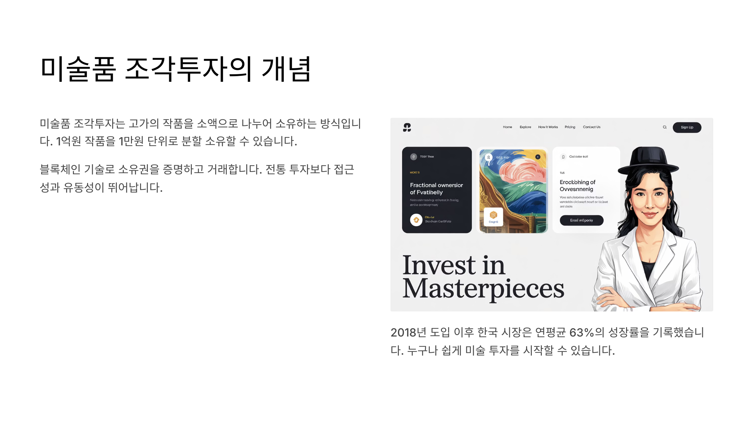 조각투자는 고가 미술품의 진입장벽을 낮추고, 예술품에 관심 있는 일반 대중에게 투자 기회를 제공해요. 주식처럼 거래 가능한 구조도 갖추고 있어서, 예술품을 단순히 소유하는 것을 넘어 수익 자산으로도 활용할 수 있는 거죠.