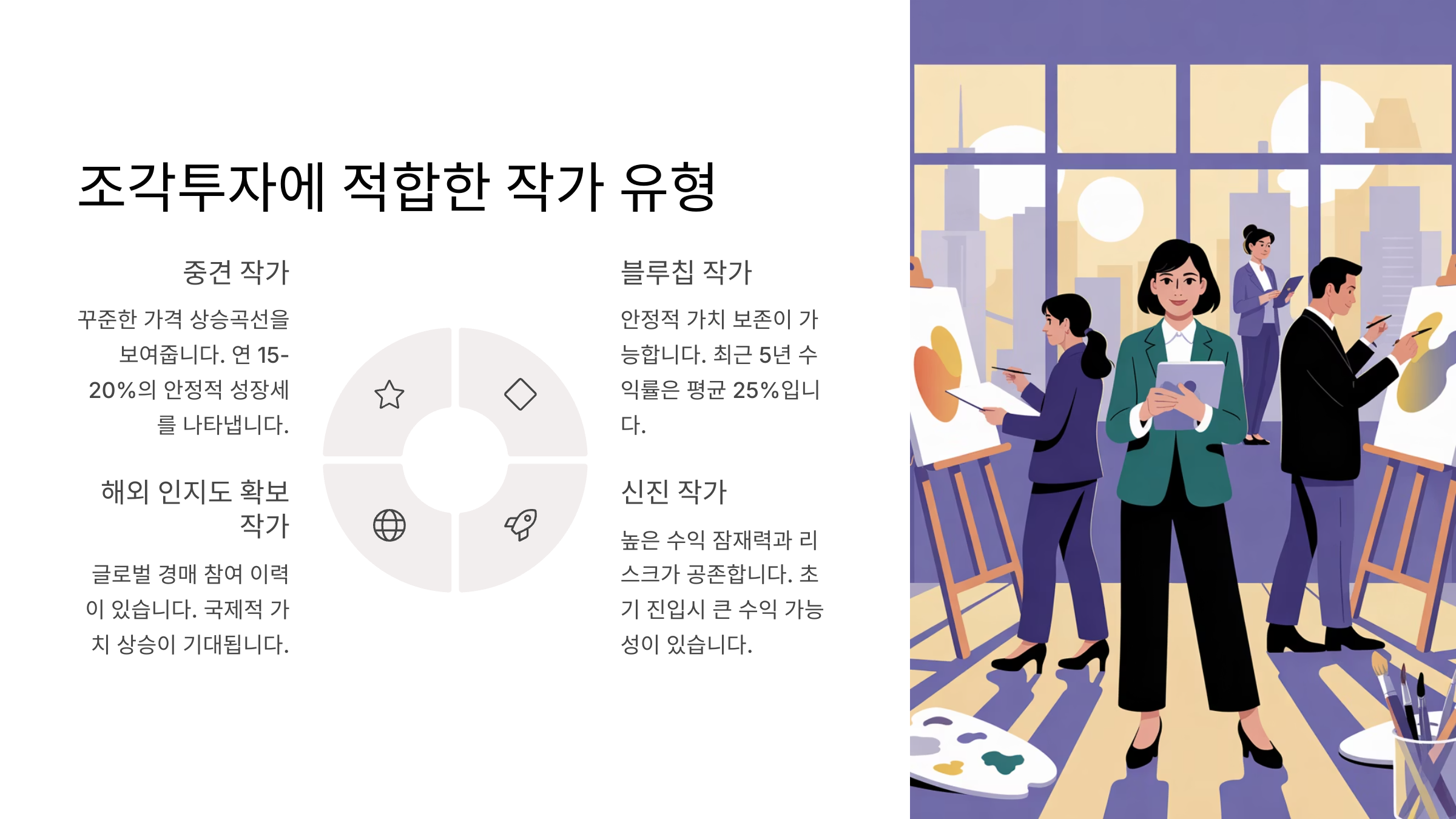 그럼, 어떤 작가들이 조각투자에 적합한지, 그 다음 섹션에서 구체적으로 알아볼게요! 🎨