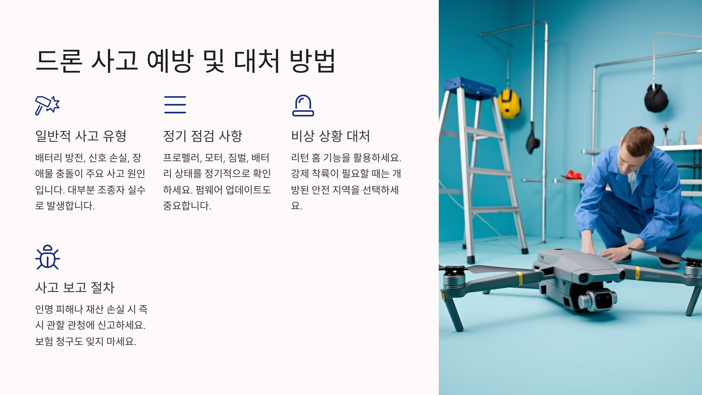 사고를 예방하려면 **배터리 상태 점검, 비행 지역 확인, 날씨 체크** 등 사전 준비가 필요해요. 비행 중에는 **주변 환경을 지속적으로 확인하고, 긴급 상황 발생 시 대처 방법**을 숙지해야 해요. 📜