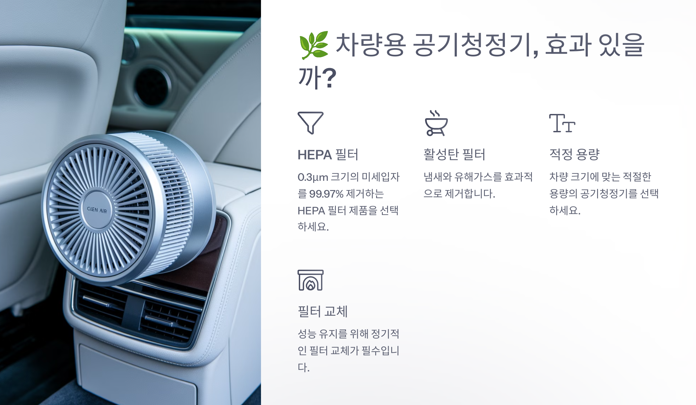 - 🚗 운전 환경 고려: 미세먼지가 많은 도심이라면 활성탄 필터나 HEPA 필터가 좋아요.