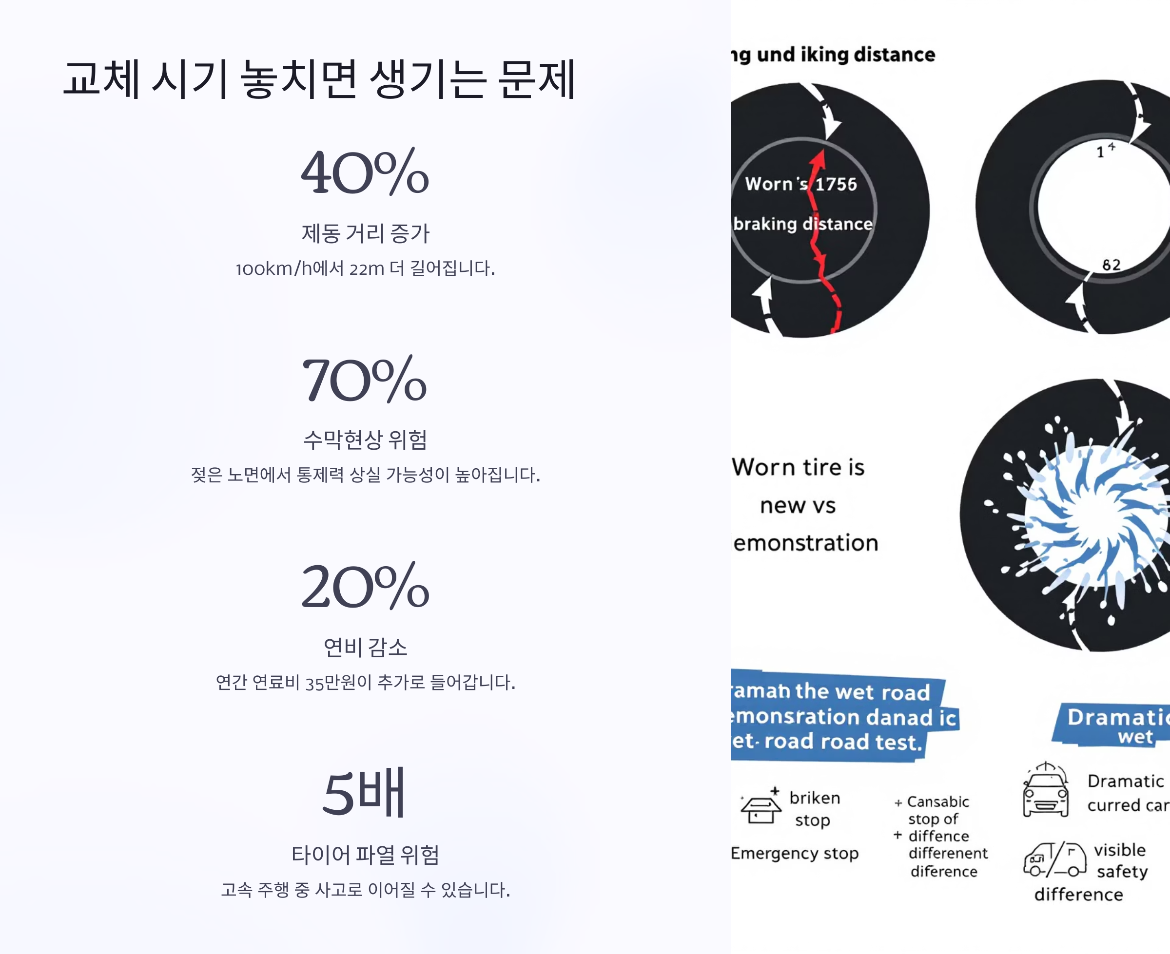 타이어 교체 시기를 놓치면 그 피해는 단순한 불편을 넘어서 ‘사고’로 이어질 수 있어요. 가장 흔한 문제는 ‘수막현상’이에요. 트레드가 닳아버리면 빗물이나 눈을 타이어가 제대로 배출하지 못해서 차량이 미끄러지는 현상이 생기거든요.