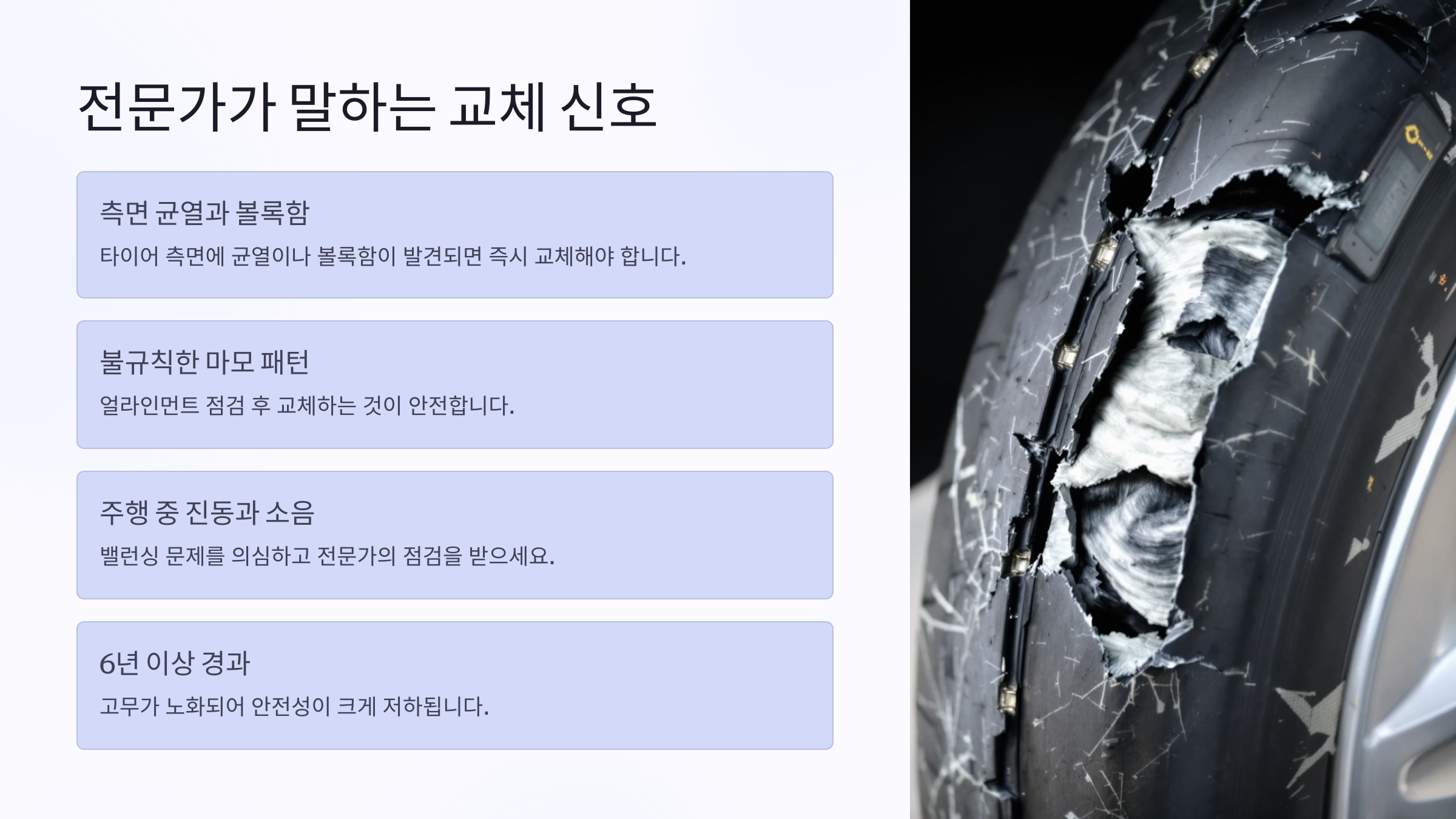 | 블로우아웃 | 고무 노화 | 고속 주행 중 타이어 폭발 | 교체 시기 확인 |