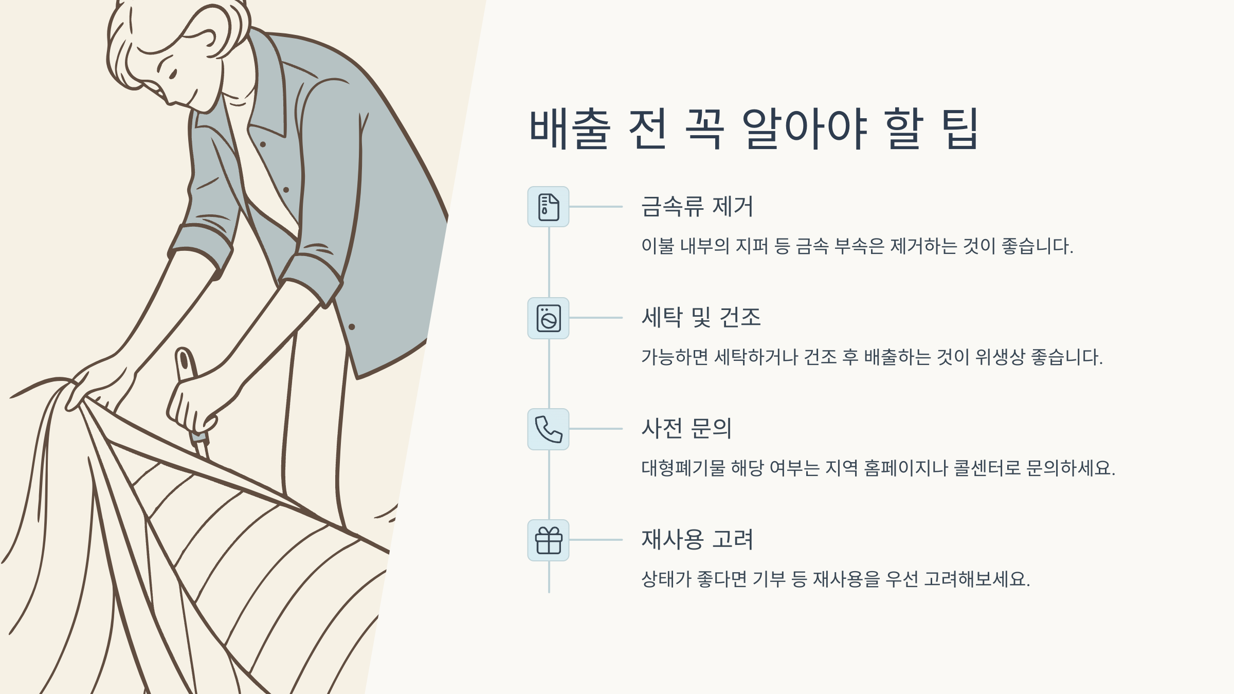 배출 시에는 이불이 젖지 않도록 비닐로 한번 더 감싸주면 좋아요. 특히 비 오는 날엔 이불이 젖어서 수거 자체가 불가능할 수 있기 때문에, 가능한 건조한 날을 선택해서 내놓는 게 좋아요. 또한 이불이 찢어지지 않게끔 단단히 묶어주는 것도 중요해요.