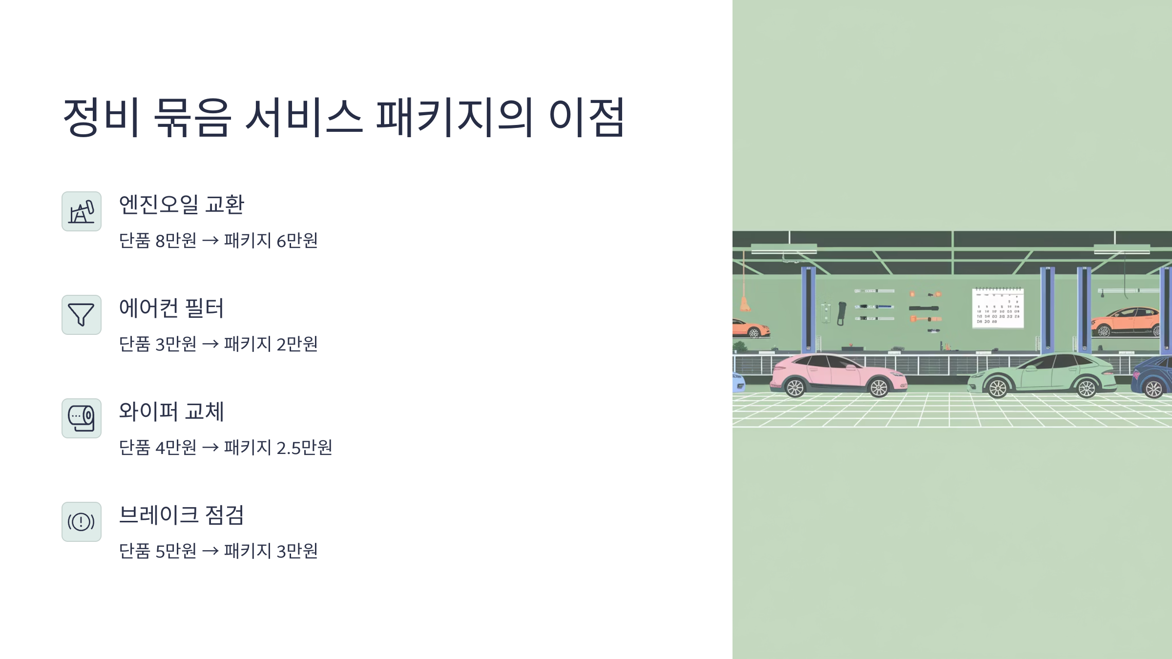 정비 항목을 따로따로 맡기면 비용이 눈덩이처럼 불어나요. 그런데 여러 항목을 **한 번에 묶어서 진행하면** 놀랄 만큼 할인폭이 커진답니다. 이게 바로 ‘정비 패키지’ 또는 ‘묶음 서비스’의 마법이에요! 💡