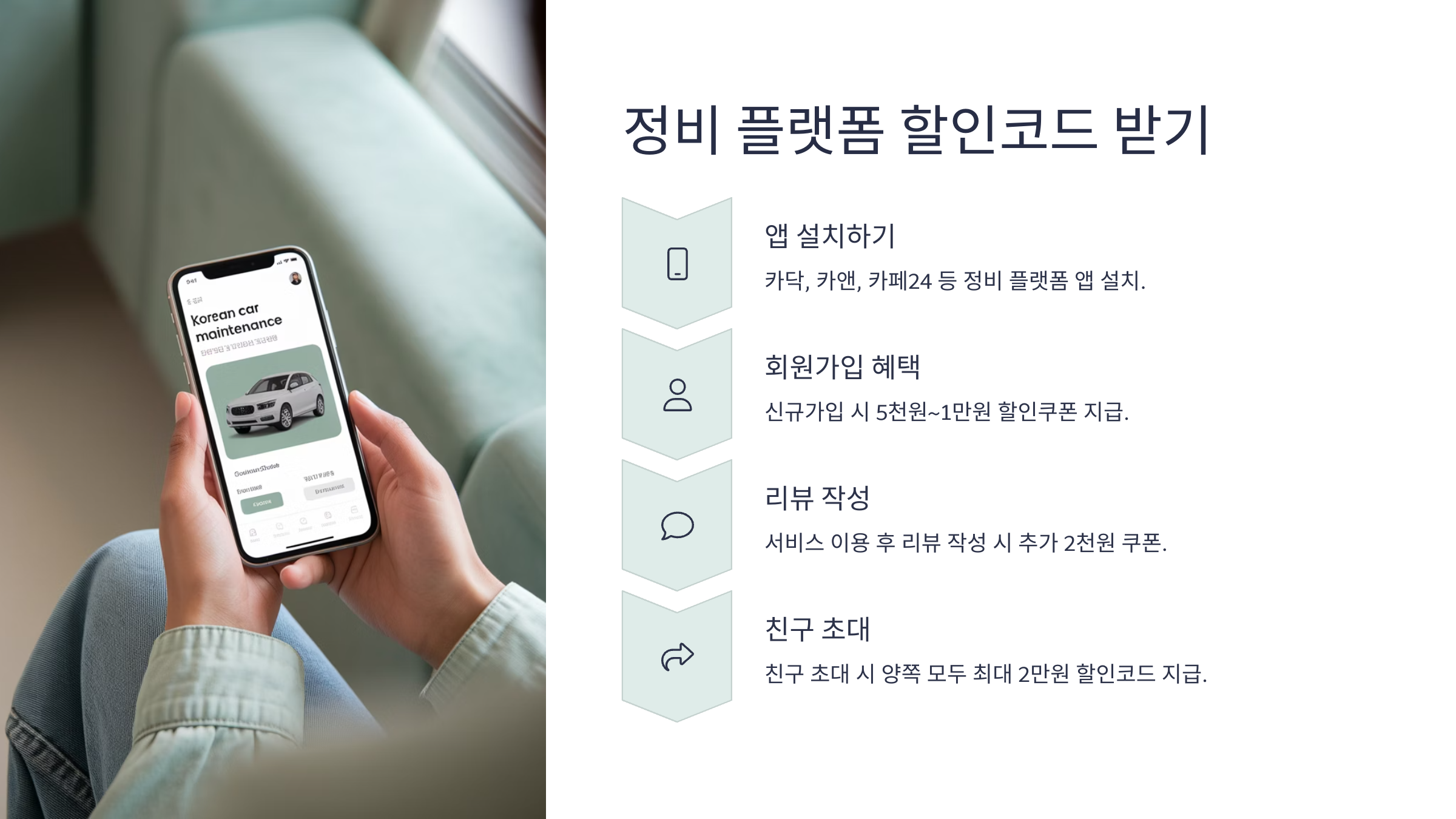 요즘은 자동차 정비도 앱으로 하는 시대! 엔카, 모두의차, 바른정비, 카픽스 같은 **온라인 정비 플랫폼**을 이용하면 깜짝 할인코드나 포인트 적립 혜택을 쉽게 받을 수 있어요. 앱 설치만 해도 바로 할인 쿠폰을 주는 곳도 많답니다. 🎉