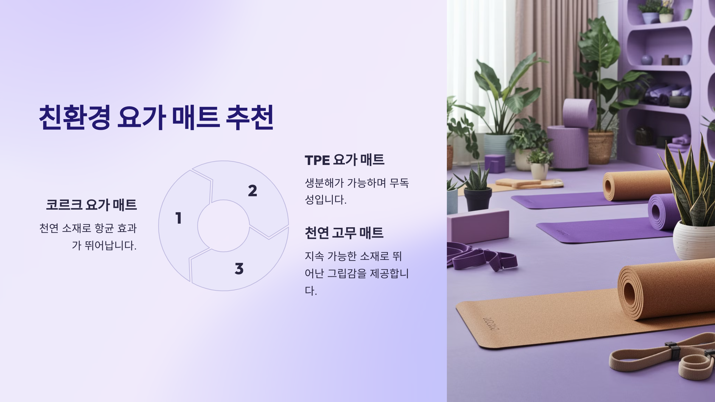 환경을 생각하는 **친환경 요가 매트**는 천연 고무, 코르크, TPE 소재로 만들어져요. 🌍