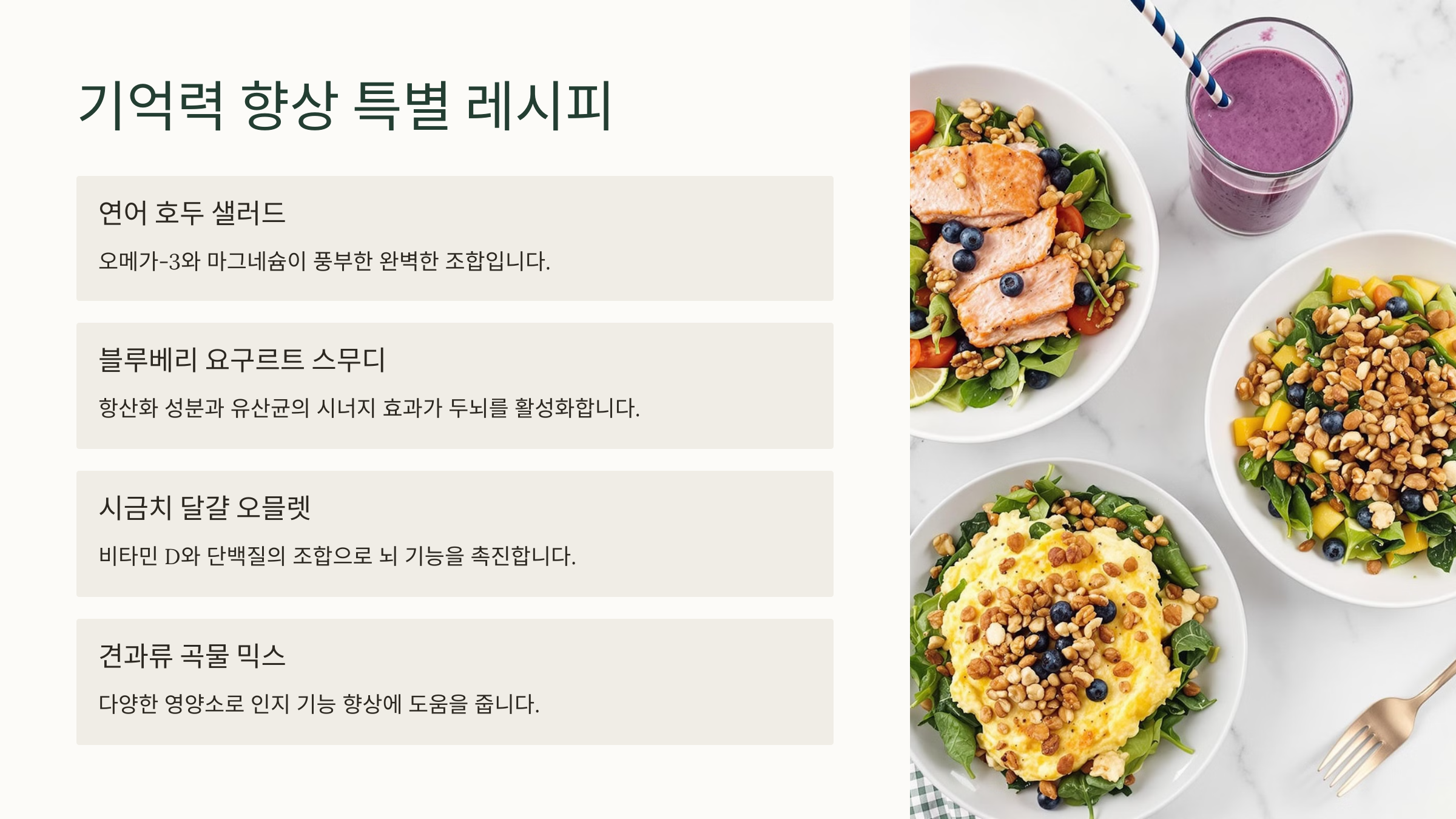 ‘기억력에 좋은 음식’은 많지만, 막상 식단에 어떻게 활용할지 막막할 수 있어요. 그래서 여기! 간단하지만 효과 확실한 뇌 건강 레시피들을 준비했어요. 재료도 구하기 쉽고 조리도 간편해서 누구나 따라 할 수 있어요. 🧠✨
