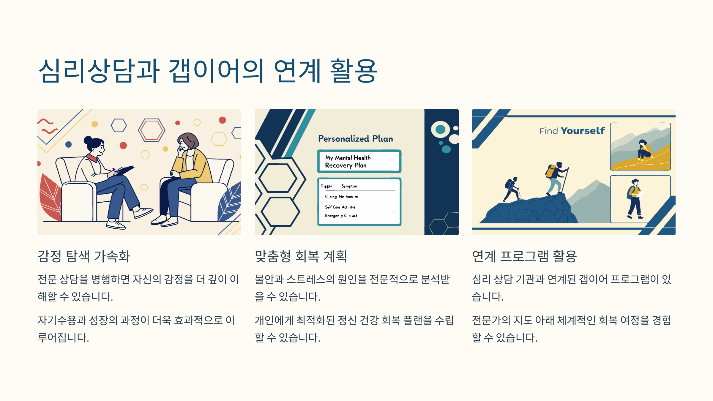 갭이어와 상담을 함께 한다면, 일상의 스트레스와 거리두기를 하면서 진짜 '나'를 들여다볼 수 있어요. 특히 성취 중심적인 사고를 내려놓고, 존재 자체를 존중받는 경험은 그 자체로 큰 치유가 되죠. 💖