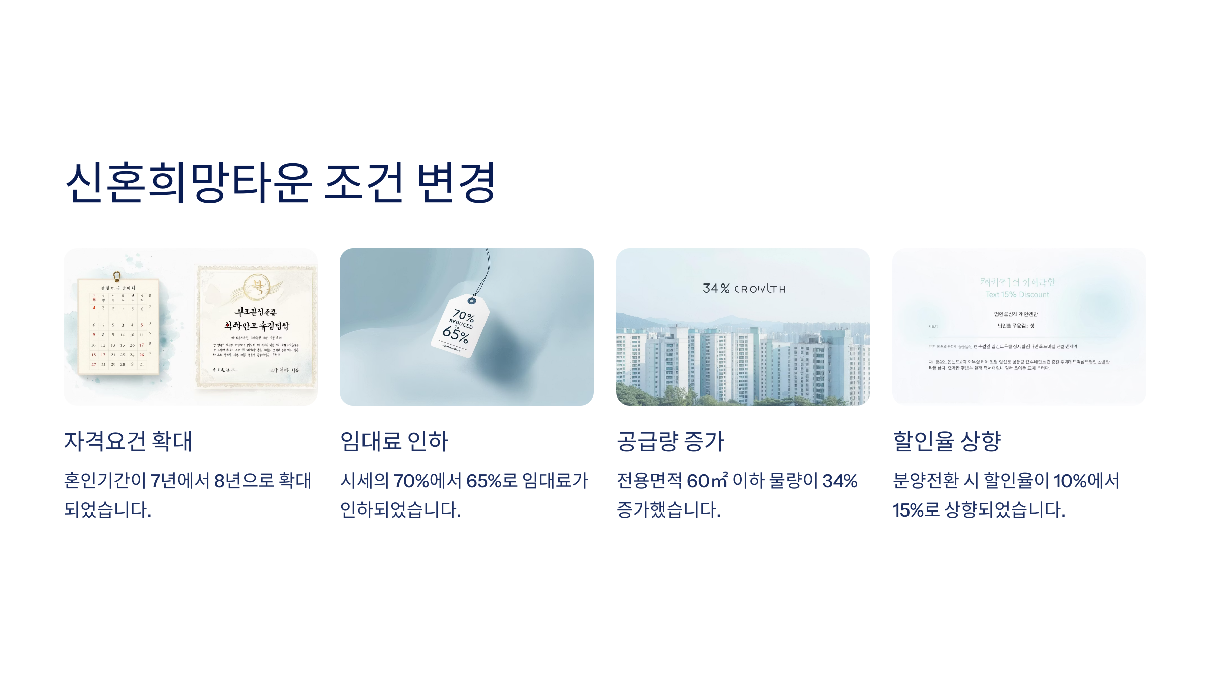 신혼희망타운은 신혼부부를 위한 공공주택 브랜드로, 내 집 마련이 어려운 젊은 세대를 위해 특별히 설계된 제도예요. 2025년부터 이 제도의 신청 조건과 입주 요건이 일부 개편되면서, 더 많은 신혼가구에게 기회가 돌아가게 됐어요.
