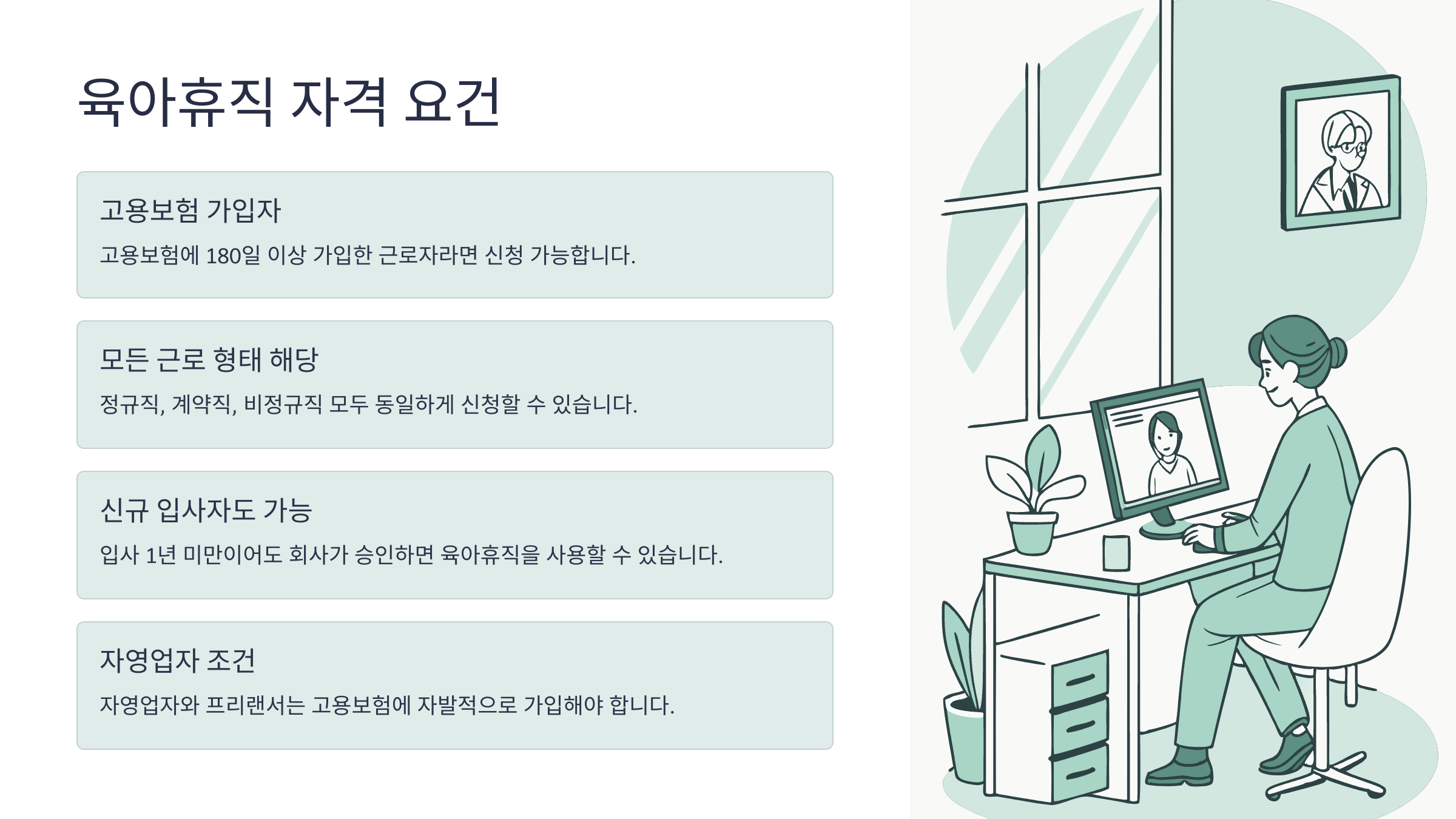 정규직뿐 아니라 계약직, 파트타임 근로자도 조건을 충족하면 육아휴직이 가능해요. 고용 형태보다는 고용보험 가입 여부와 기간이 중요한 기준이랍니다. 예전에는 비정규직은 배제되는 분위기였지만, 요즘은 법적으로 동일한 권리를 보장하고 있어요.