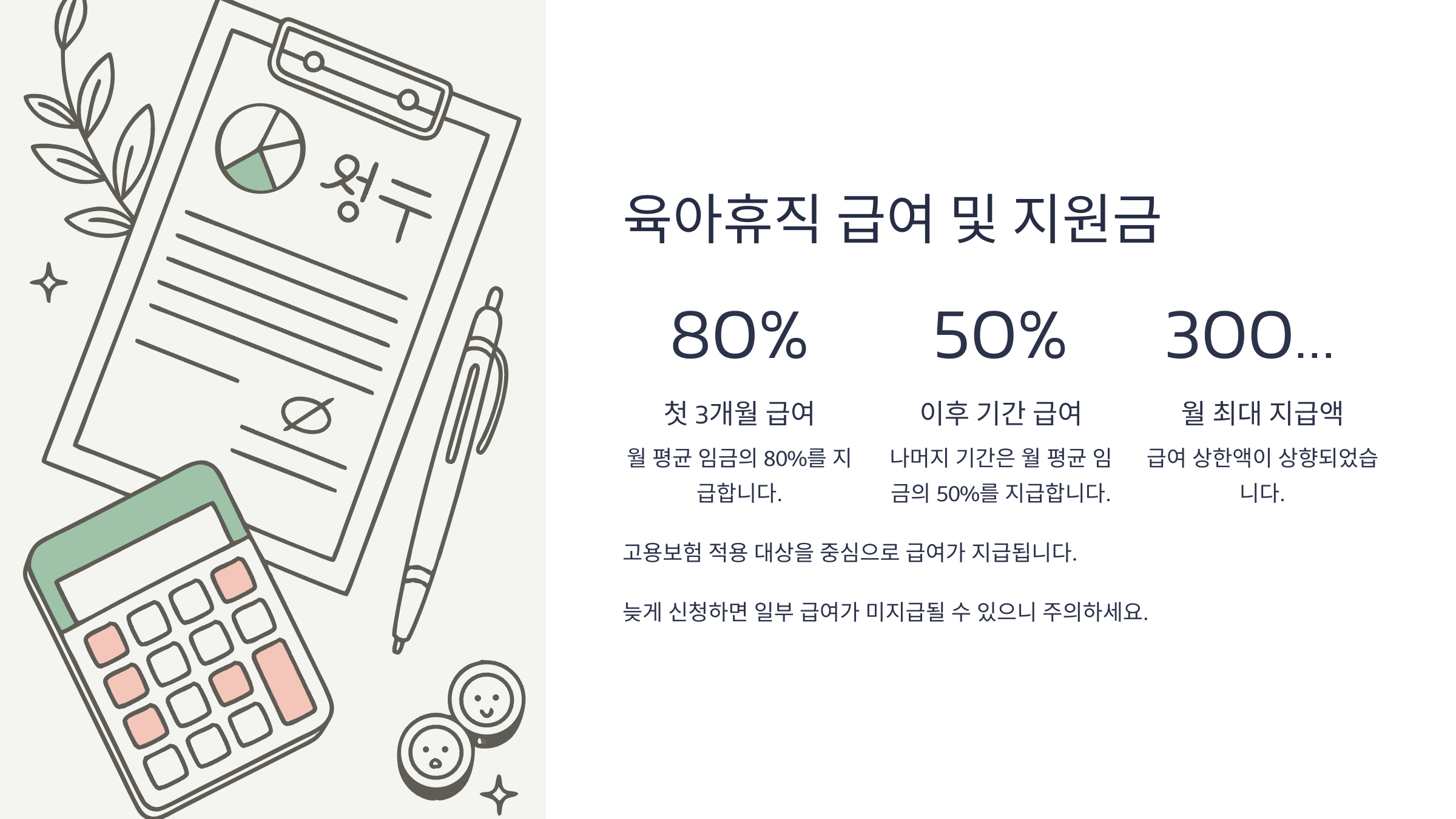 2025년 기준으로 육아휴직 급여는 첫 3개월 동안 **통상임금의 80%**를 받을 수 있고, 이후 9개월은 **통상임금의 50%**를 받아요. 단, 월 최대 150만 원, 최소 100만 원의 상·하한이 정해져 있어요. 급여가 너무 낮거나 높아도 그 범위에서 조정돼요.