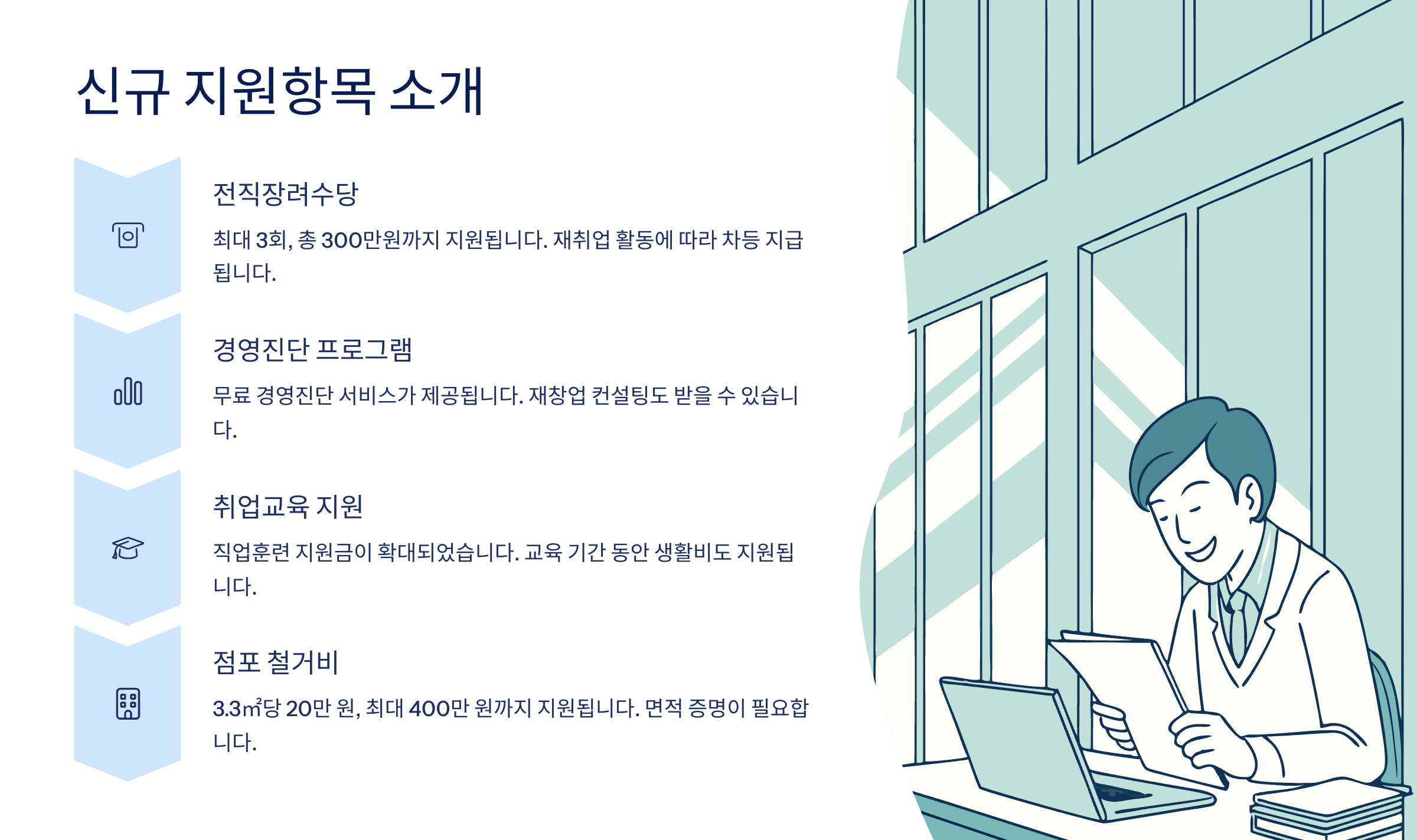 2025년부터 새롭게 도입된 폐업 소상공인 지원 항목은 기존의 단순 재기지원금을 넘어, **심리적 회복, 재능 전환, 비대면 창업 전환**까지 폭넓게 확대되었어요. 단지 금전적 보상이 아니라 인생 재설계까지 고려한 정책이라는 게 인상 깊죠.