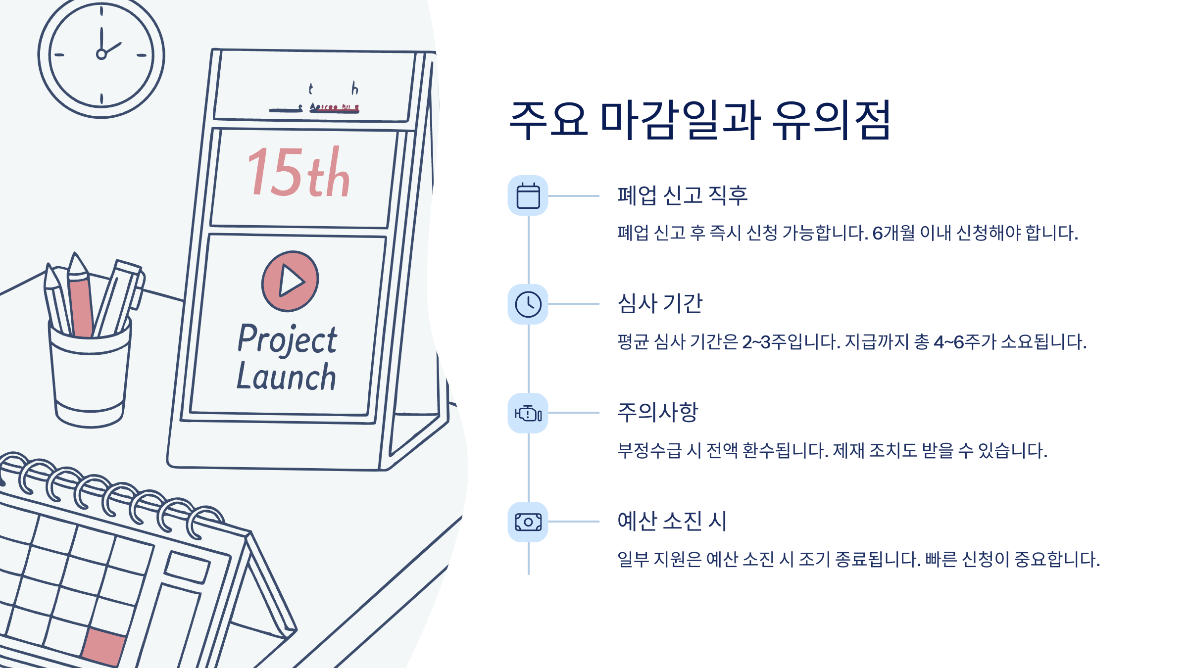 폐업 지원금은 언제 신청하느냐가 정말 중요해요. 대부분의 제도가 상시 신청 가능하다고 알려져 있지만, 실제로는 예산 소진 방식이기 때문에 **신청 시기**에 따라 받을 수 있는 금액과 혜택이 달라질 수 있답니다.