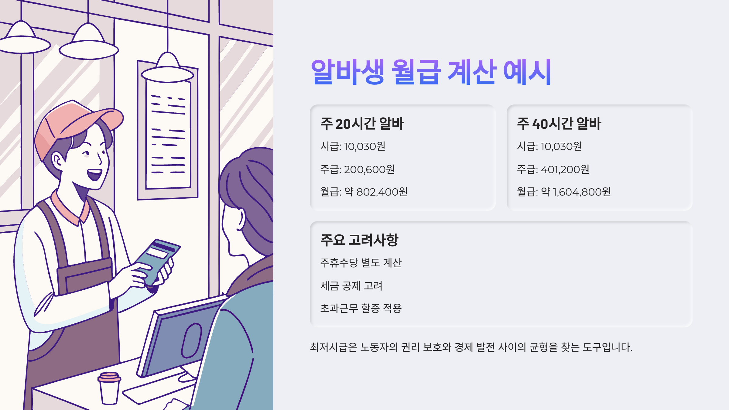 다음은 최저시급을 기준으로 아르바이트생이 월 얼마를 받을 수 있을지 구체적인 계산 예시로 확인해볼게요! 💸