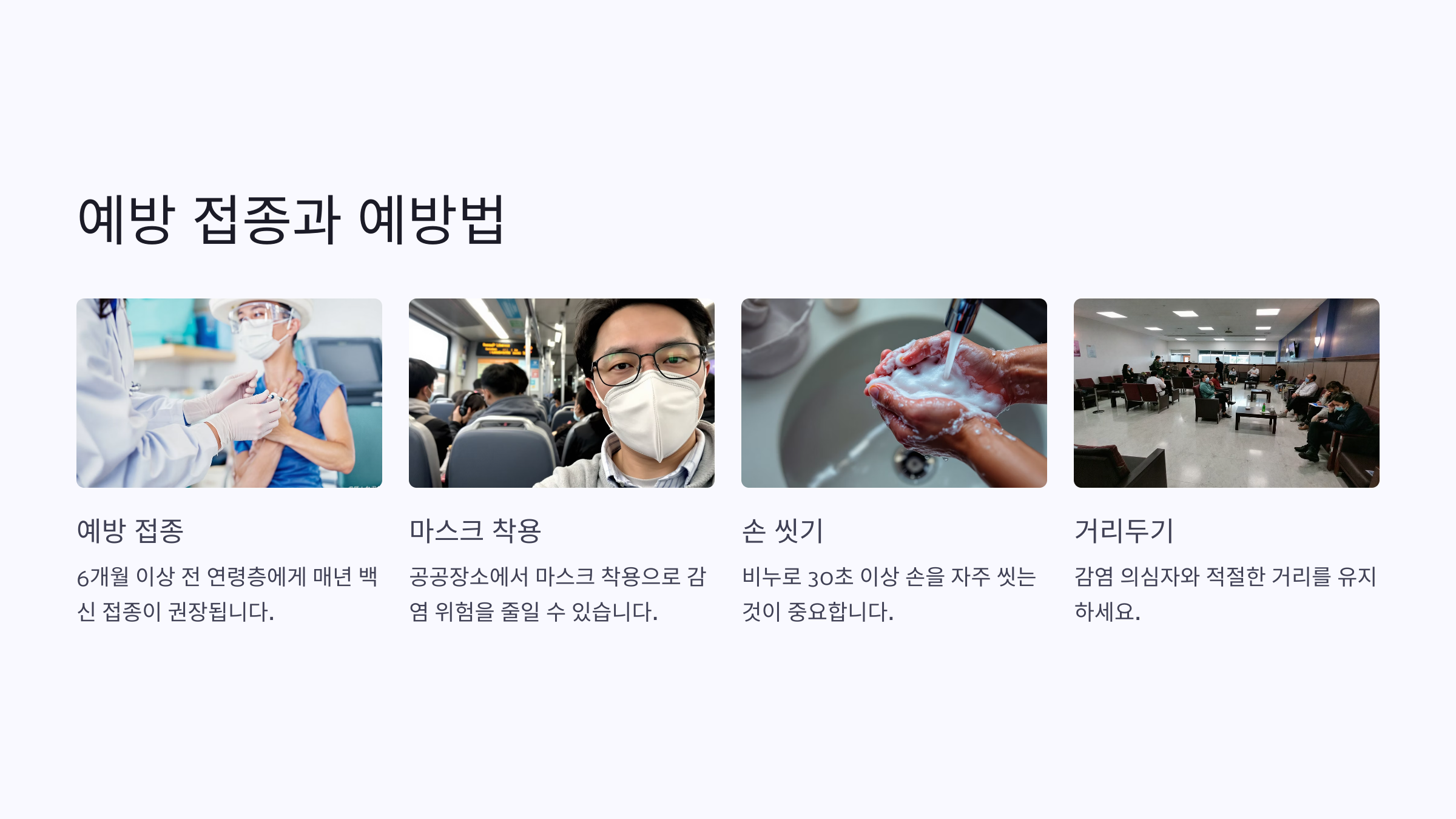 | 독감 백신 접종 | 매년 가을 | 유행 전 2주 여유 두기 |