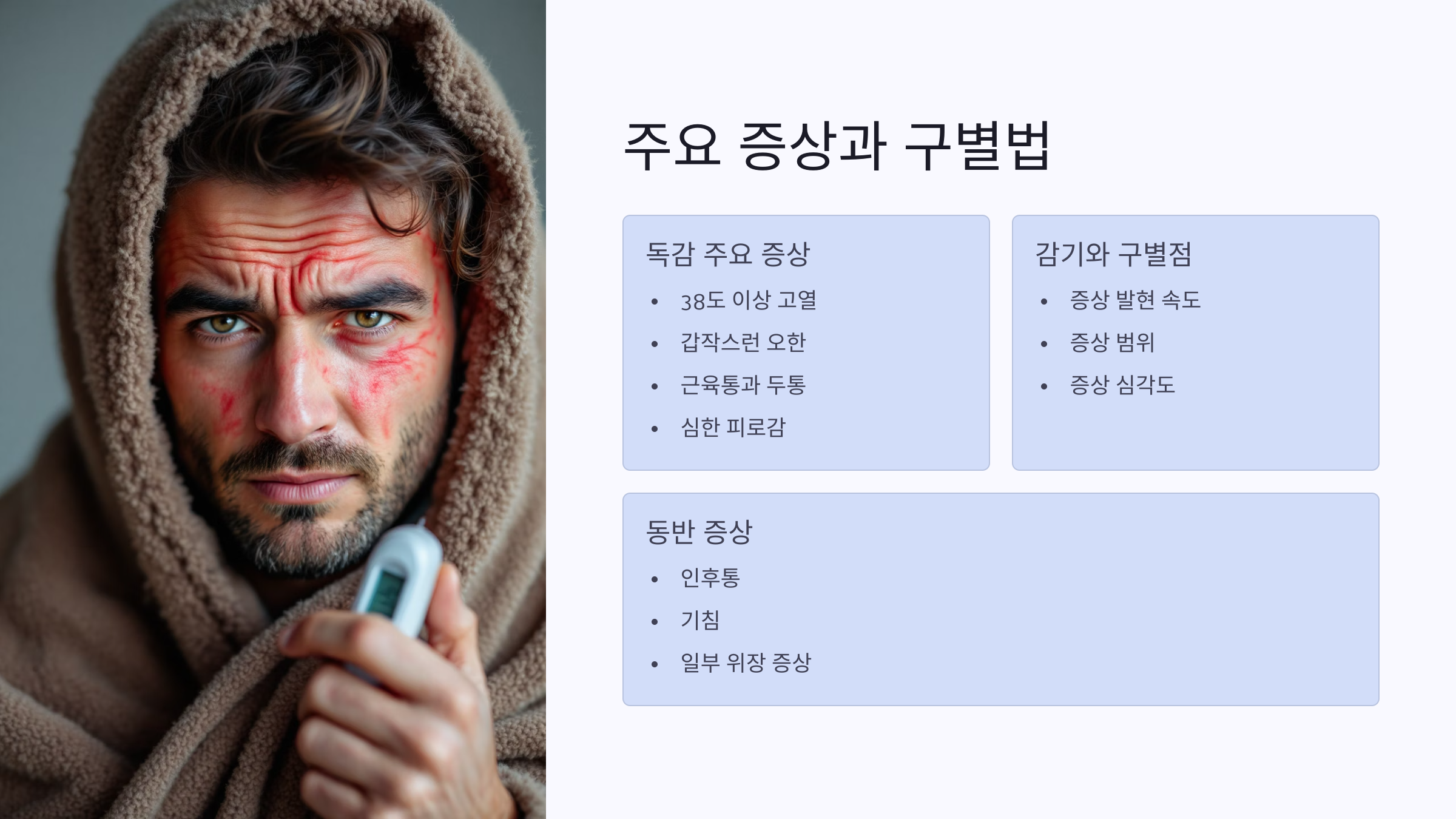 또한 코로나19와 증상이 겹치는 경우도 많기 때문에 혼동하기 쉬워요. 코로나는 후각·미각 소실이 특징이고, 독감은 갑작스럽게 아프고 열이 올라가는 게 포인트예요. 둘 다 감별을 위해 병원에서 검사받는 걸 추천해요.