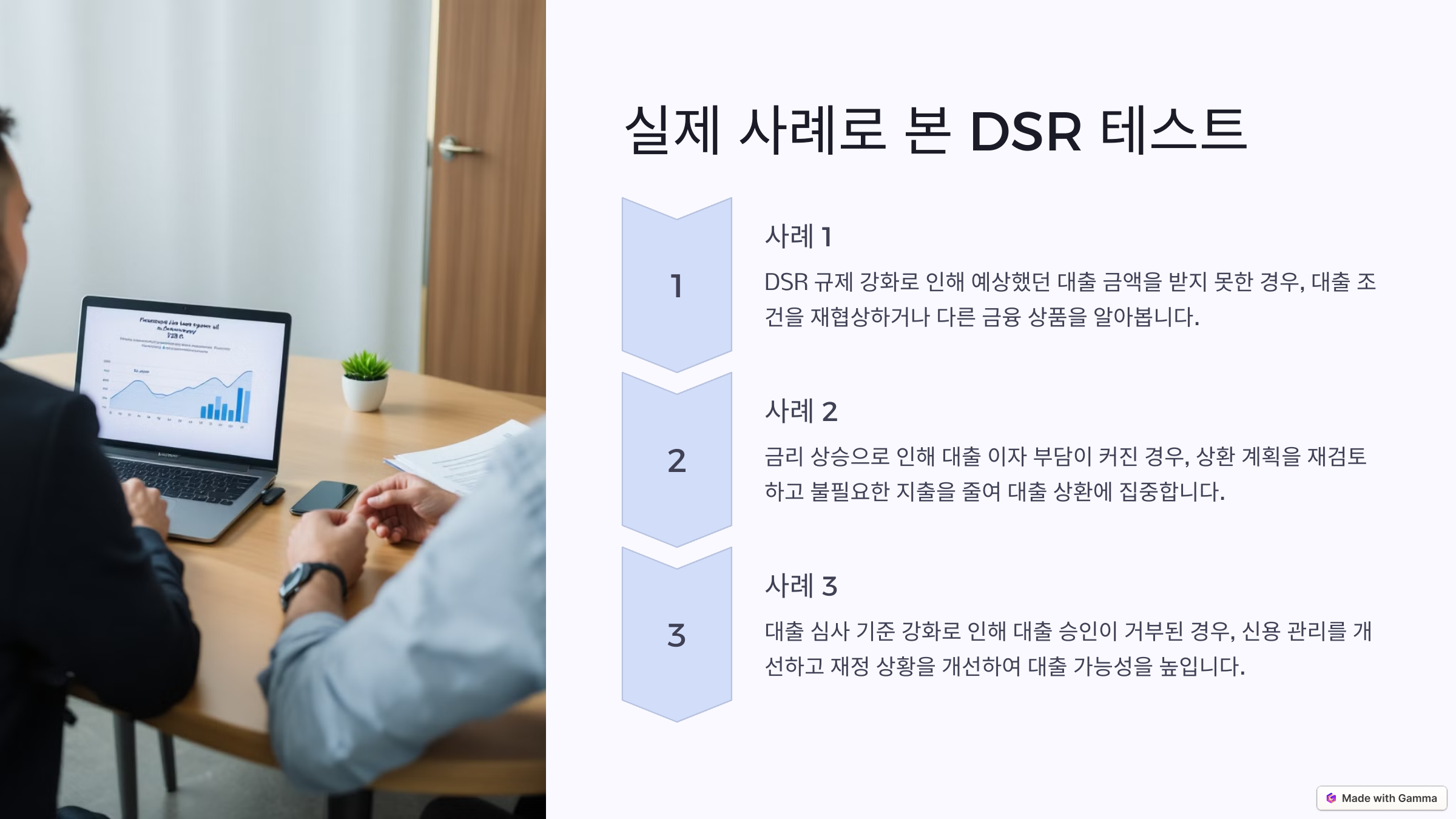 반면, 박 씨는 기존에 1억 원의 신용 대출이 있었고, 추가로 주택담보대출을 신청했어요. DSR 기준이 모든 대출을 통합해 계산되면서, 박 씨의 DSR이 소득의 60%를 초과하게 되었고, 대출 승인이 거절되었어요. 박 씨는 신용 대출을 먼저 상환한 후 주택담보대출을 다시 신청하기로 했답니다.