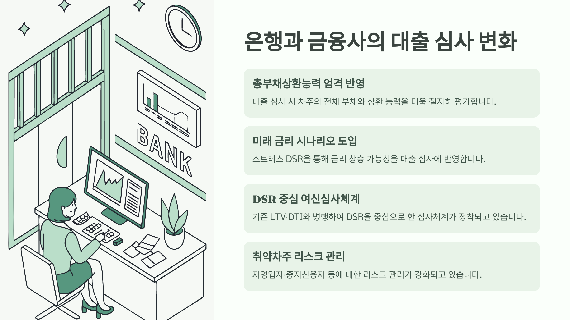 다음 섹션에서는 이런 DSR 변화에 맞춰 은행과 금융기관이 어떻게 대출 심사를 바꾸고 있는지, 실제 심사 방식의 변화와 흐름을 다룰게요! 🏦