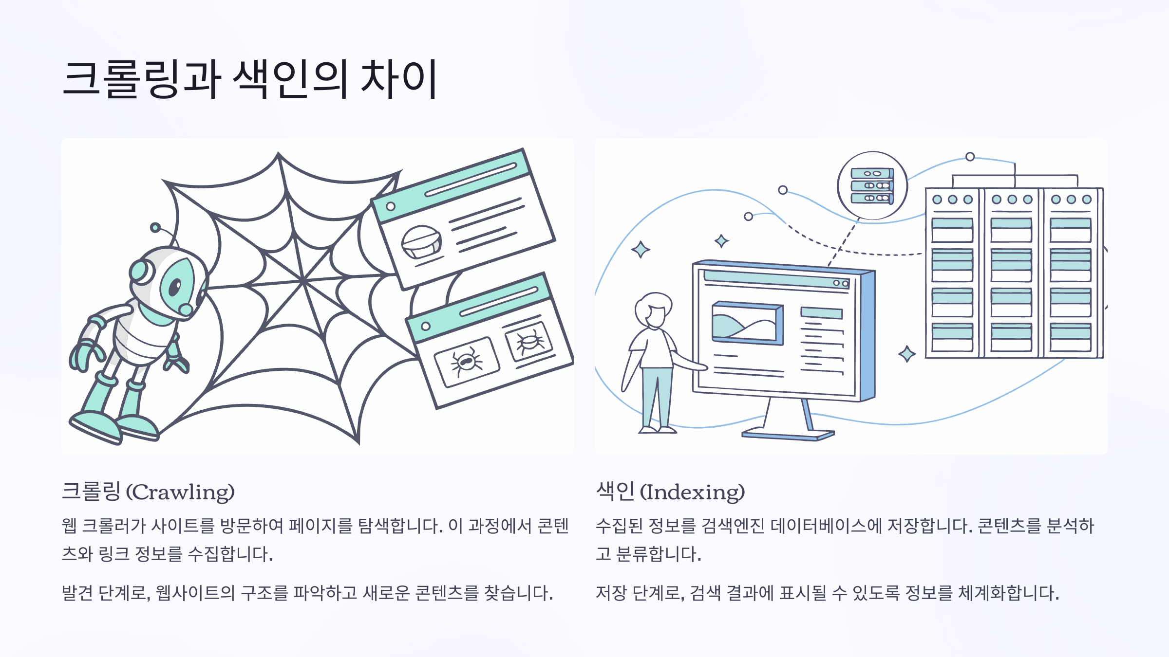 크롤링(Crawling)은 구글봇이 여러분의 사이트에 방문해서 페이지를 수집하는 과정이에요. 반면 색인(Indexing)은 수집된 정보를 구글 검색 엔진에 등록하는 과정이에요. 둘은 별개의 단계예요!