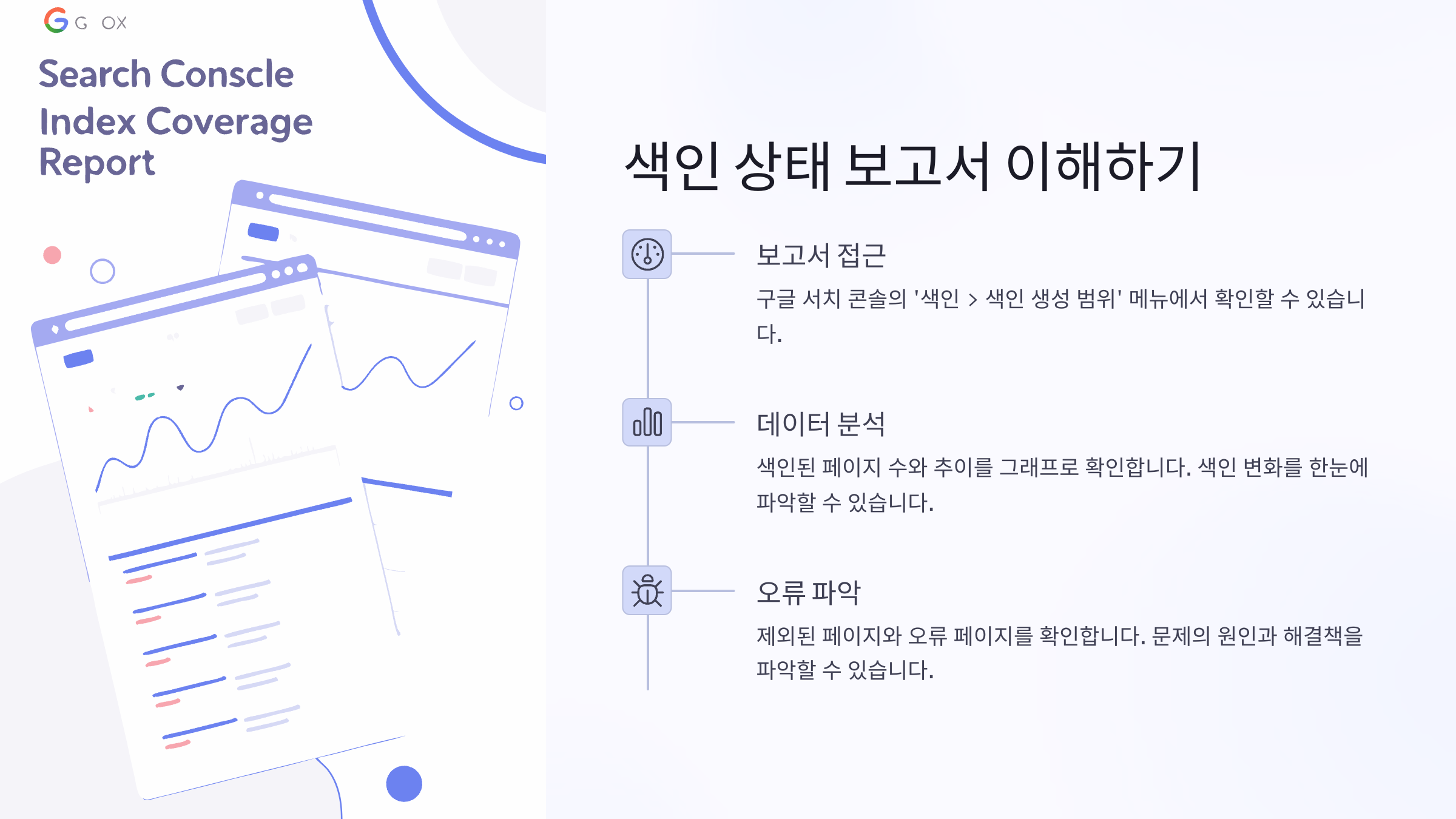 구글 서치 콘솔에서 가장 먼저 확인해야 할 기능 중 하나가 바로 ‘색인 상태 보고서’예요. 이 보고서는 내 사이트에 등록된 페이지 수, 색인 제외된 페이지, 오류 발생 여부 등을 한눈에 보여줘요.