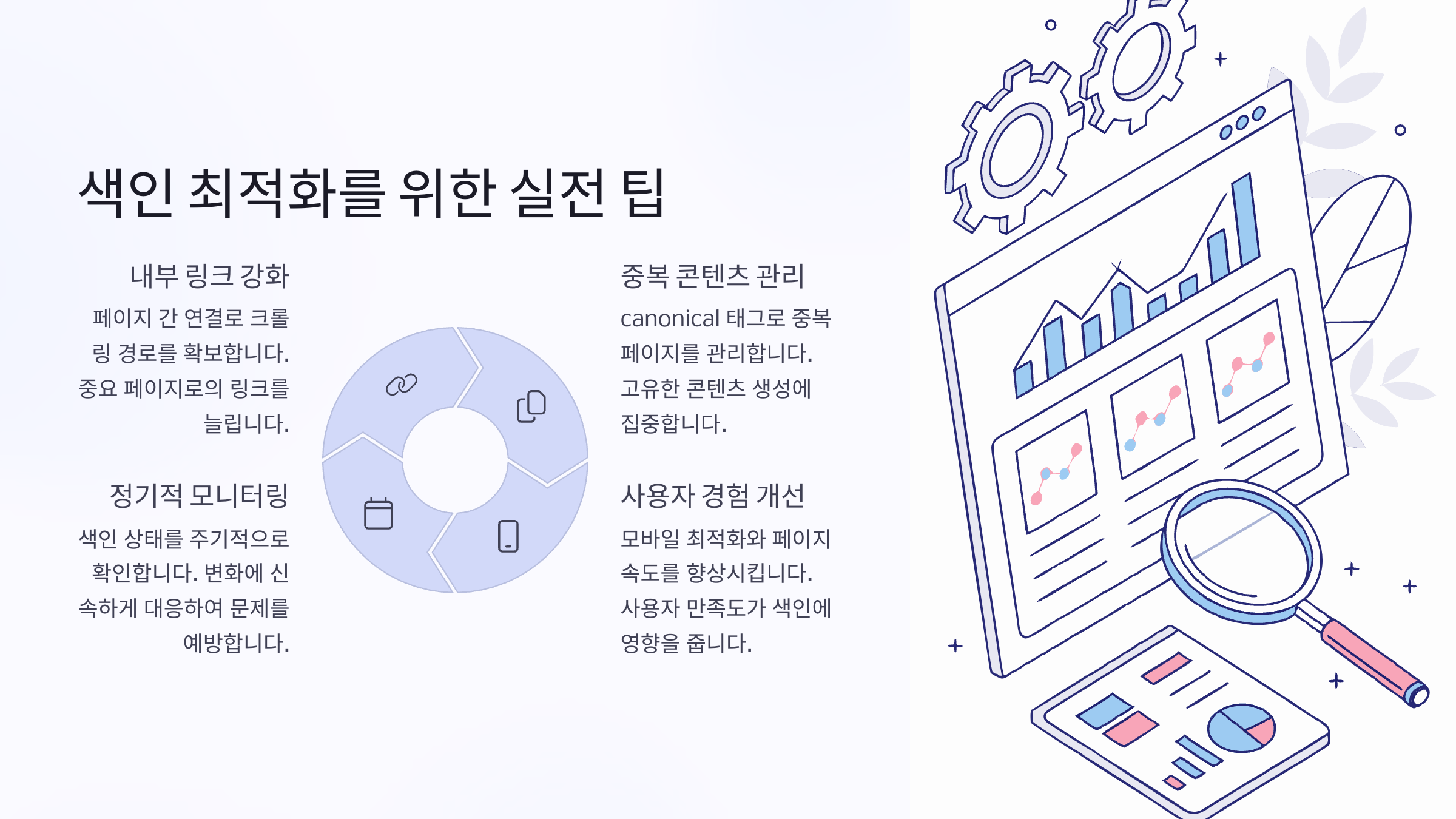 셋째, **콘텐츠 구조화**예요. 제목 태그(H1~H3), 메타디스크립션, 이미지 ALT 태그 등을 꼼꼼하게 써야 색인 효율이 높아져요. 구글은 ‘읽기 쉬운’ 페이지를 좋아하니까요!
